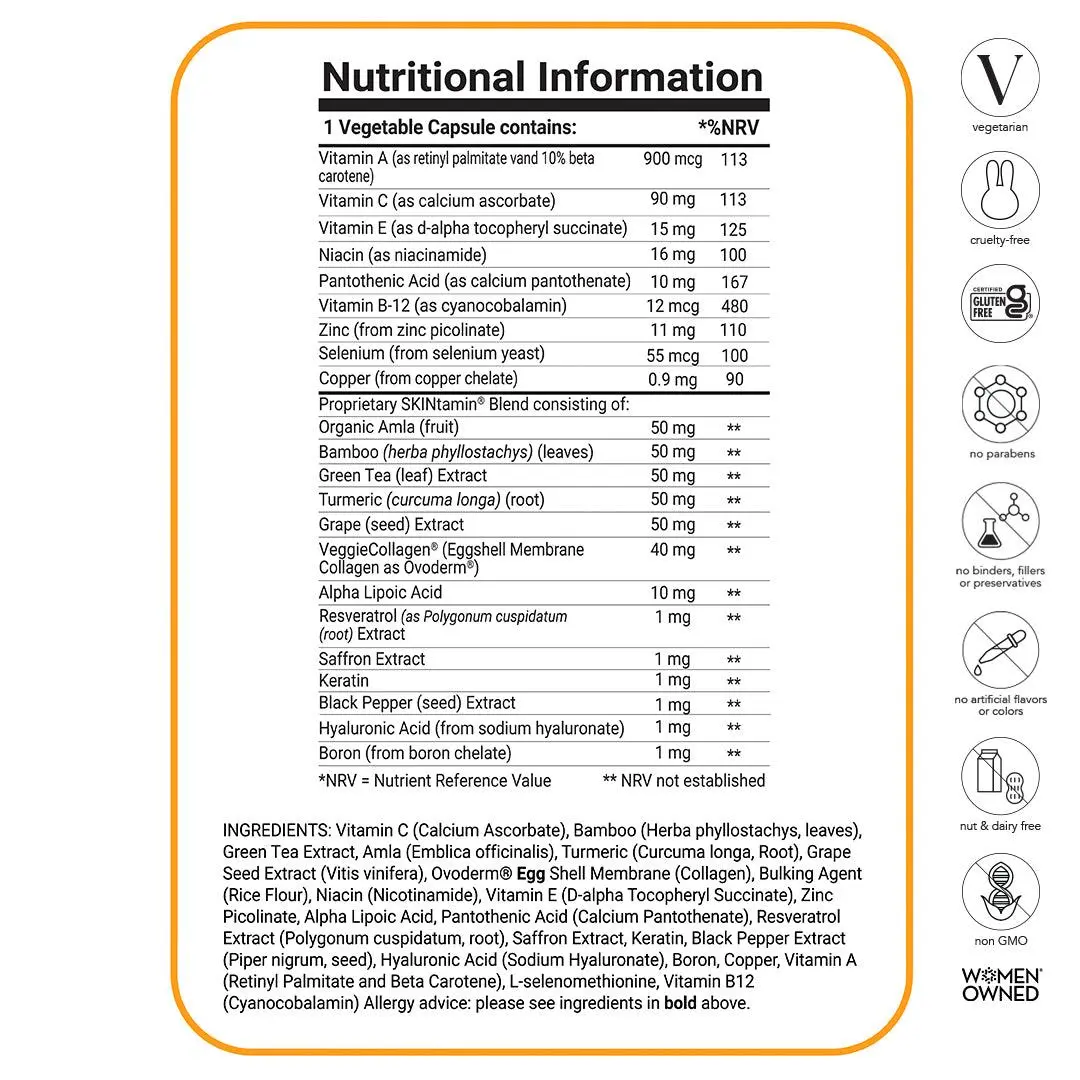 ·Essential Vitamins & Minerals:Vitamins A, C, E, B12Zinc, Selenium, Copper, NiacinPantothenic Acid, Boron, Alpha Lipoic Acid, Hyaluronic Acid, Keratin