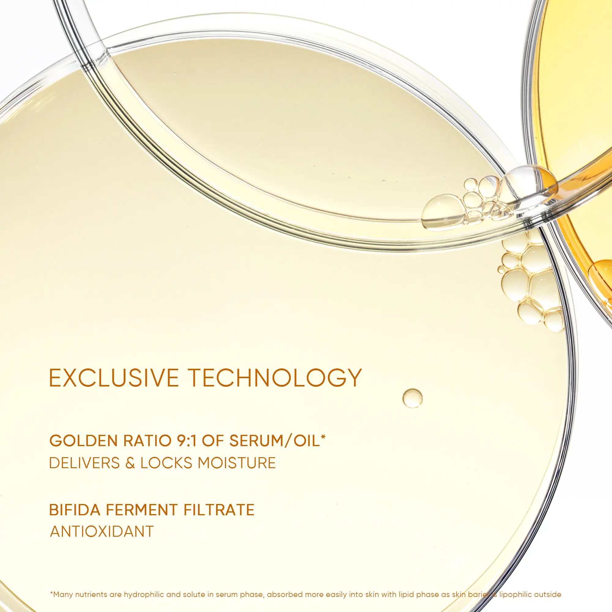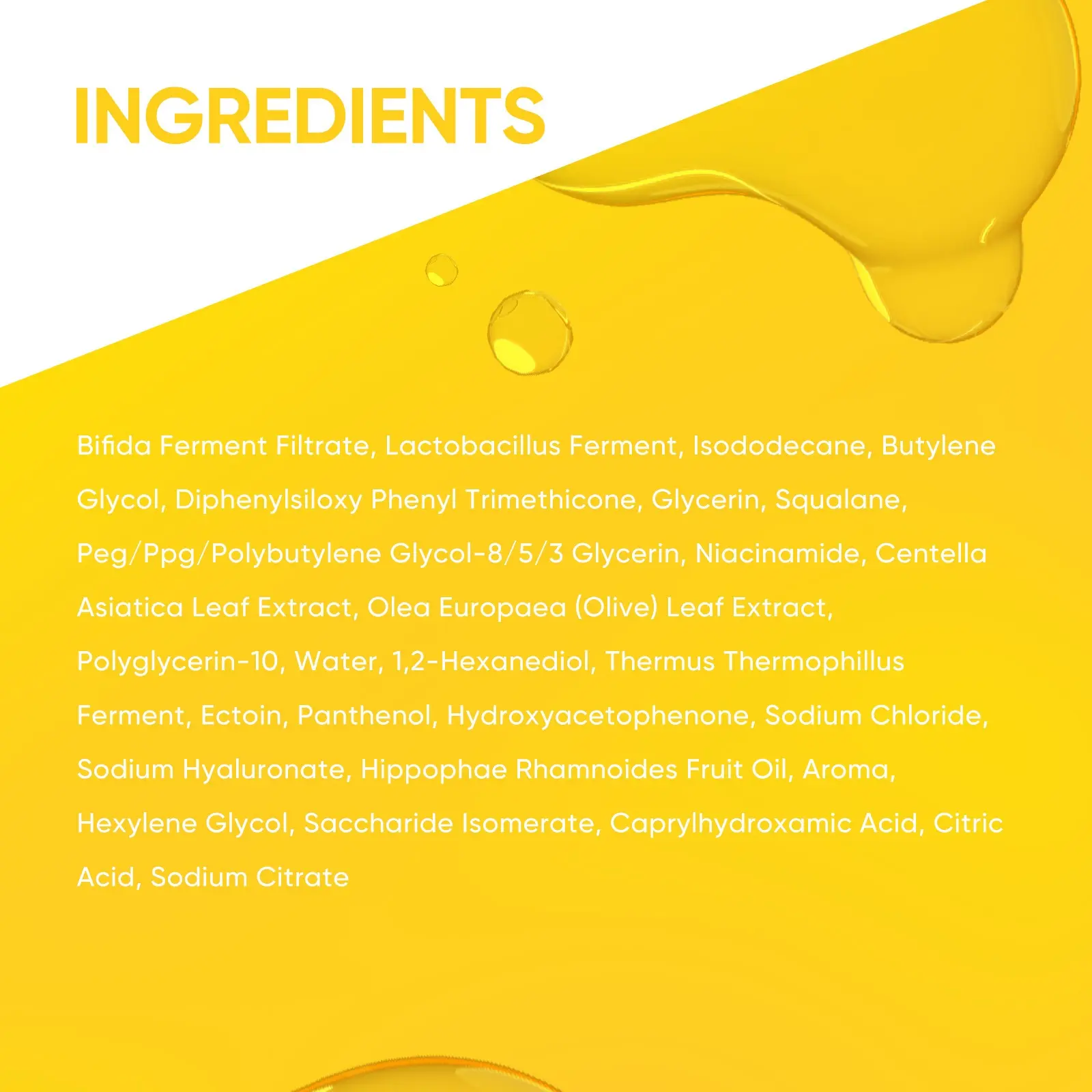 Shake to activate our unique two-layer formula! The water-based serum (with Bifida Ferment, Ectoin, and Centella) hydrates and repairs. The lightweight oil (with Squalane and Sea Buckthorn) locks in moisture and adds glow. Together, they work synergistically for deep nourishment and a radiant finish.