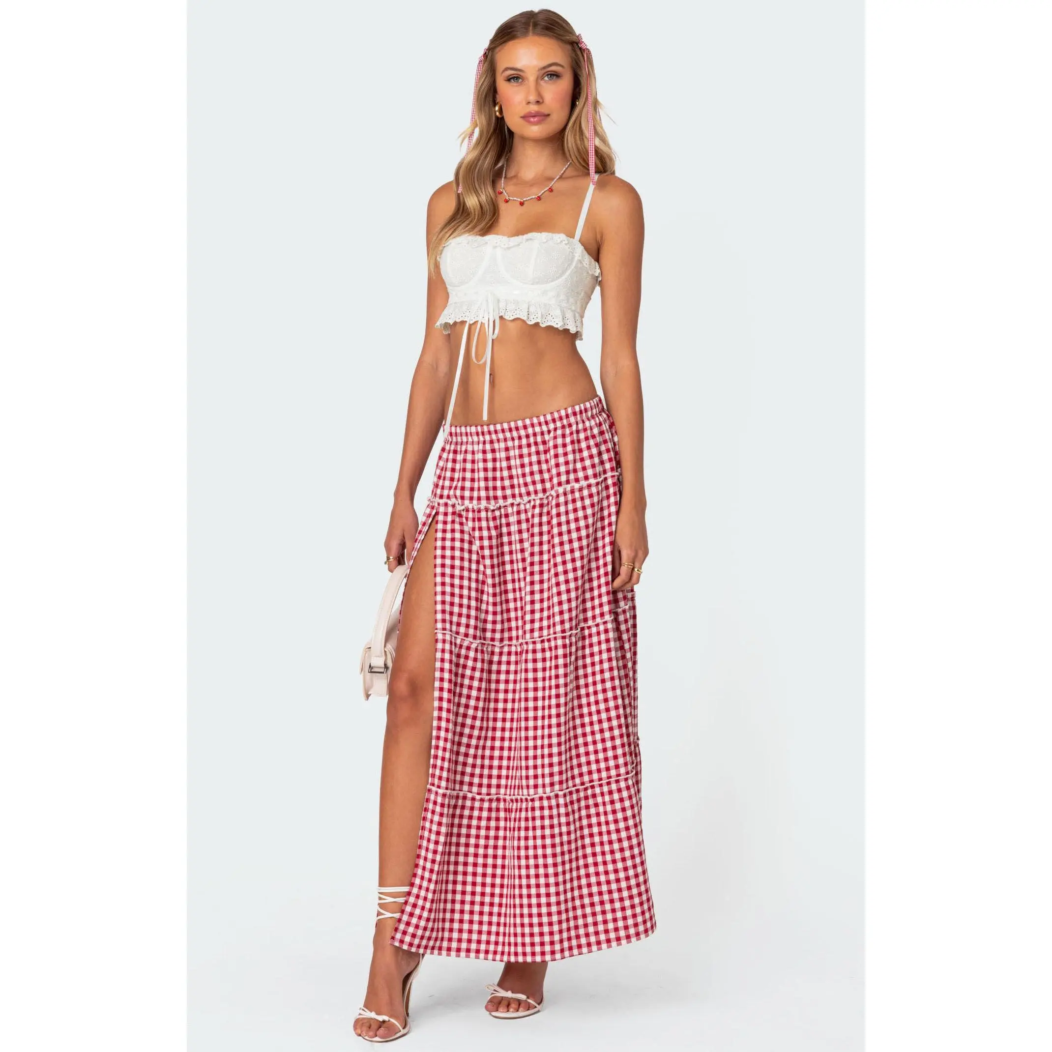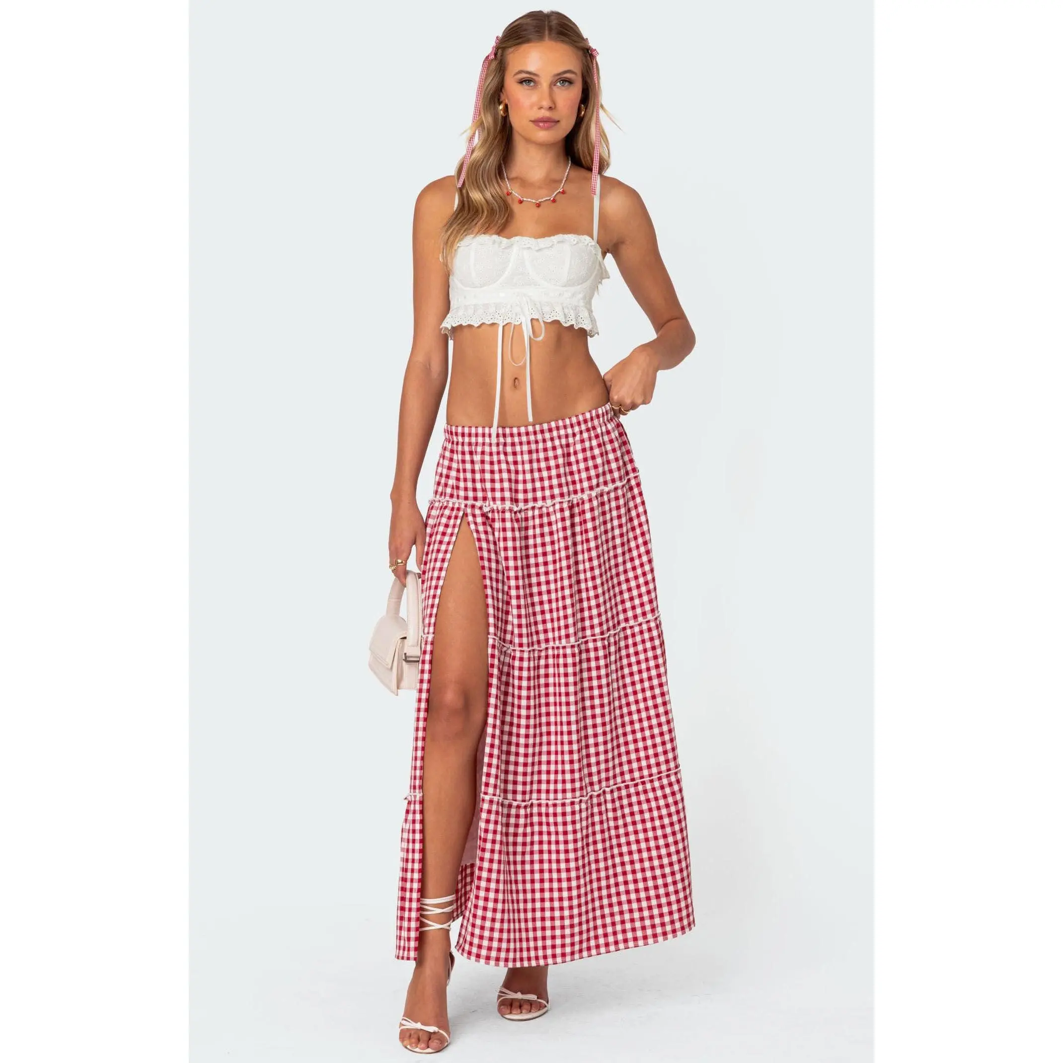 Online Only! Meet the Edikted Gingham Side Slit Tiered Maxi Skirt, your ultimate summer style companion! With its low-rise silhouette and eye-catching dramatic slit, this maxi skirt is designed to turn heads wherever you go. Its tiered design adds a playful touch, while the elastic waistband ensures a comfortable fit. Finished with a charming gingham pattern, it's perfect for adding a pop of personality to your warm-weather wardrobe.
