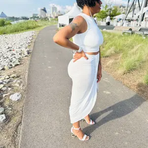 Women's crewneck crop tops and wrap draped midi skirt set. Sleeveless style with a sexy side slit. Elegant frontal ruched design. Comfortable calf length. Soft fitting summer cover ups. 🌞