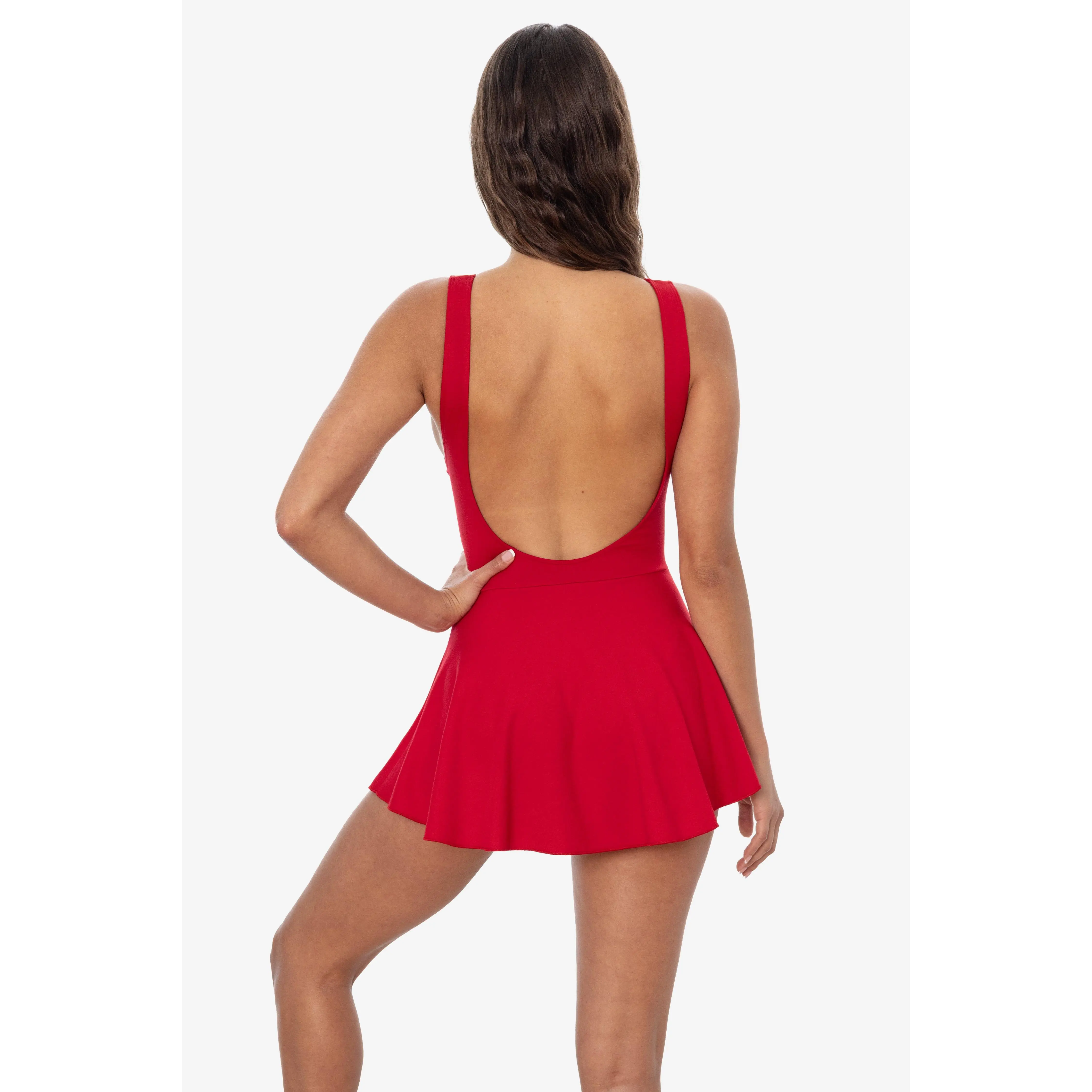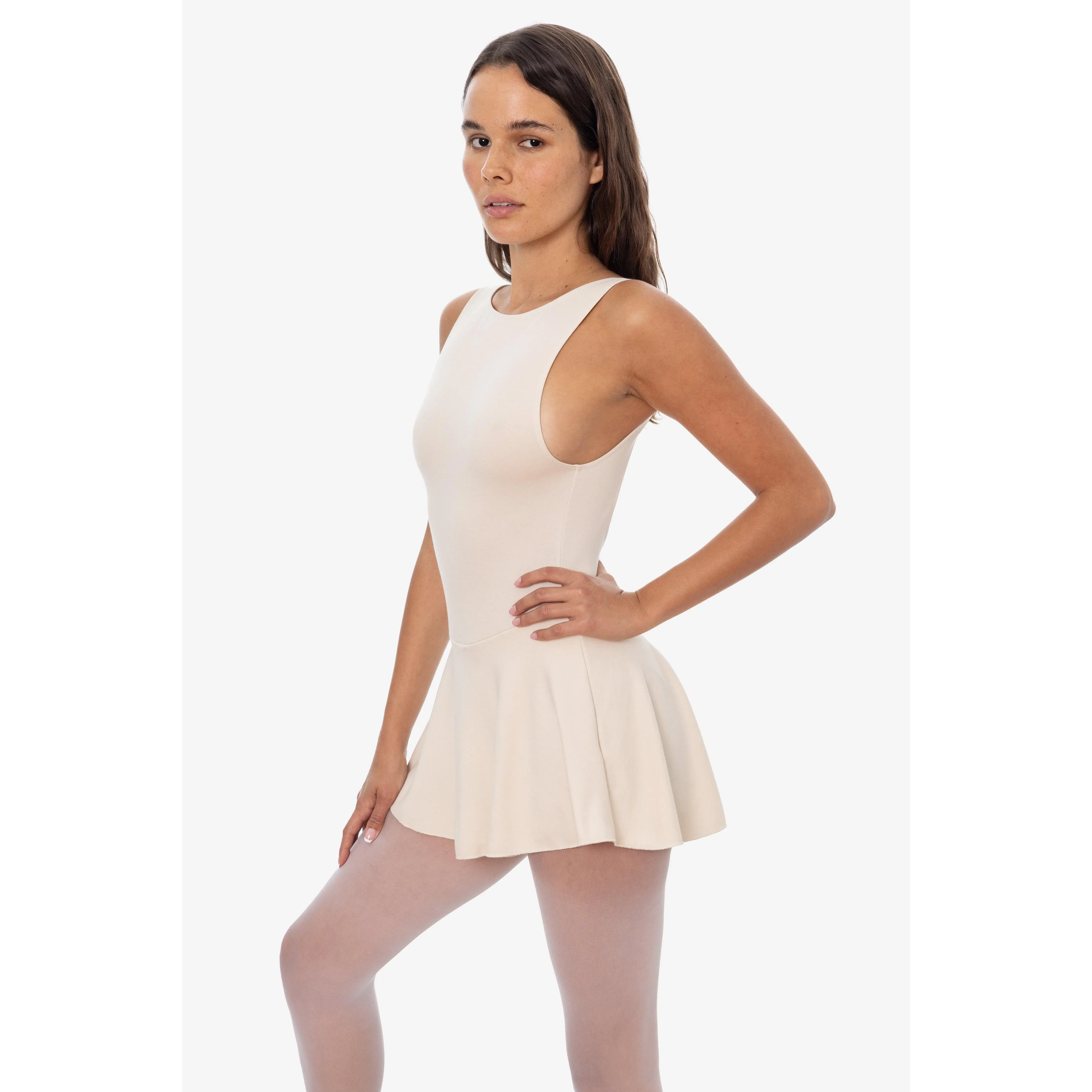 This skirted leotard is made of our smooth and timeless Ponte fabric for an elegant, yet flirty dancewear-inspired look. This Leotard/mini dress mash up features full briefs attached inside so you can move freely and twirl around with the flared skirt. This piece has a similar silhouette to our B303GD Garment Dye Boatneck Bodysuit with a high neckline, low armholes and deep scoop back. To tone down this bold look, we recommend completing the look with a pair of tights or fishnets. Made in Los Angeles, Calif.Our experienced sewers earn up to $25 an hour and no less than $17.87; additionally workers have healthcare benefits for less than $15 per week, a 401k plan, paid sick days, subsidized bus passes and favorable overtime benefits.• Ponte di Roma• Made in Los Angeles, Calif.• Wash Cold• Pre-laundered for minimal shrinkage• 60% Rayon / 35% Nylon / 5% Elastane