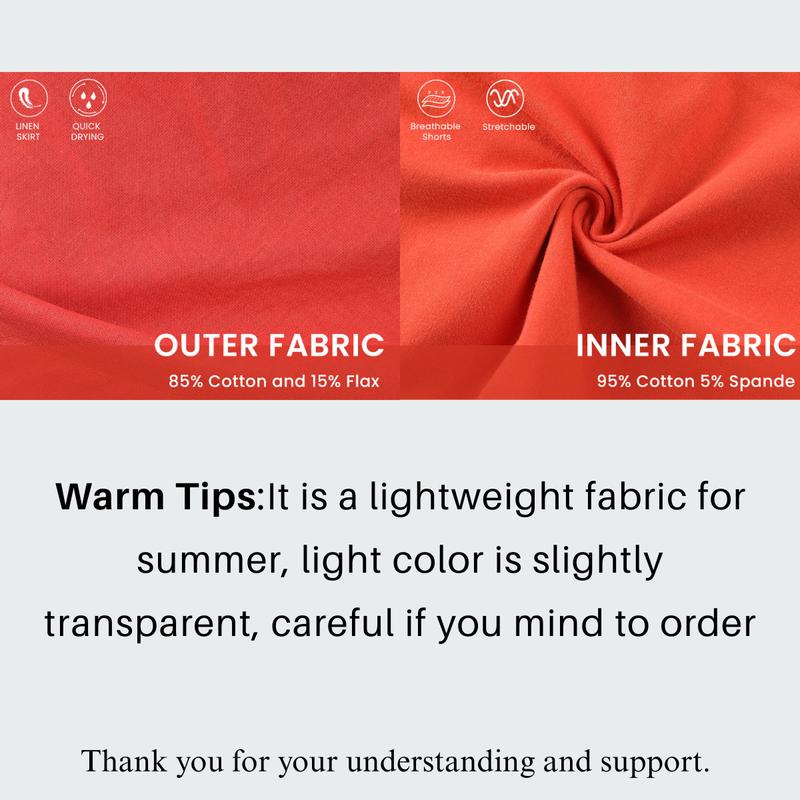 Material: These beach skorts are made of lightweight, breathable material that keeps you fresh and soft in hot day. Overlay Skirt: 85% Cotton and 15% Flax. Shorts lining: 95% Cotton 5% Spande.