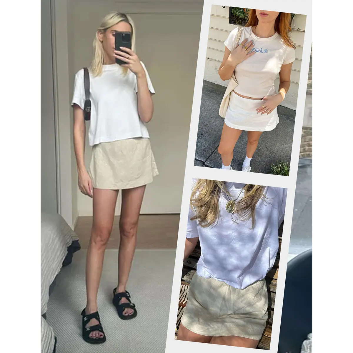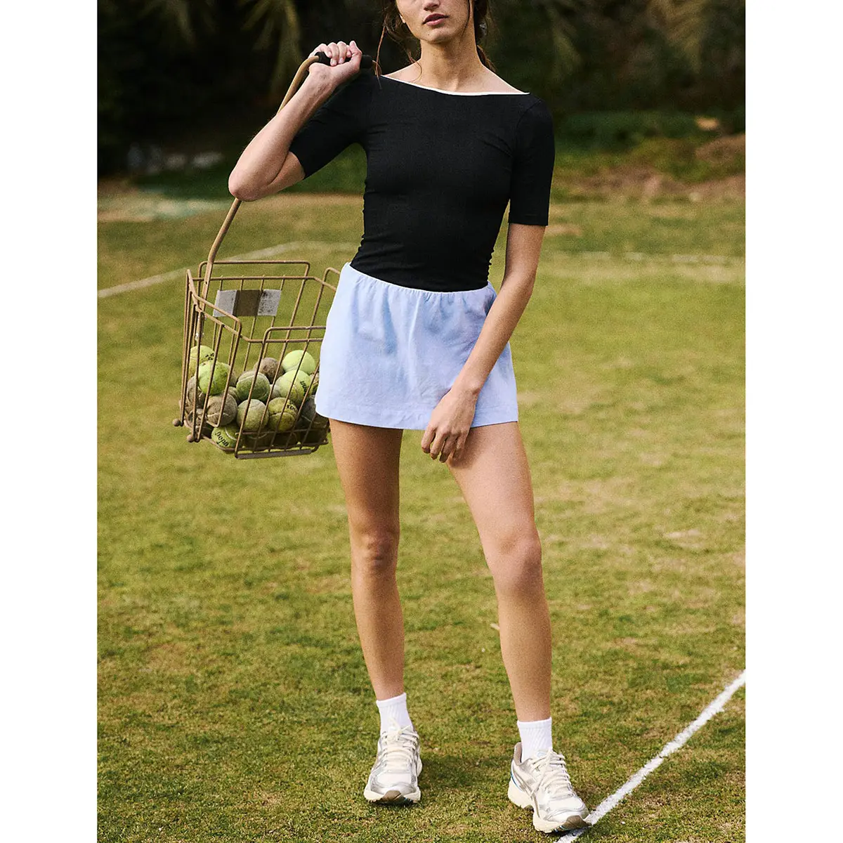 Feature: Low-rise, micro skort silhouette, inner elastic waistband for pleated A-line skirt, soft fabrication with built-in shorts, reversible design for pull-on ease, no pockets, relaxed fit.