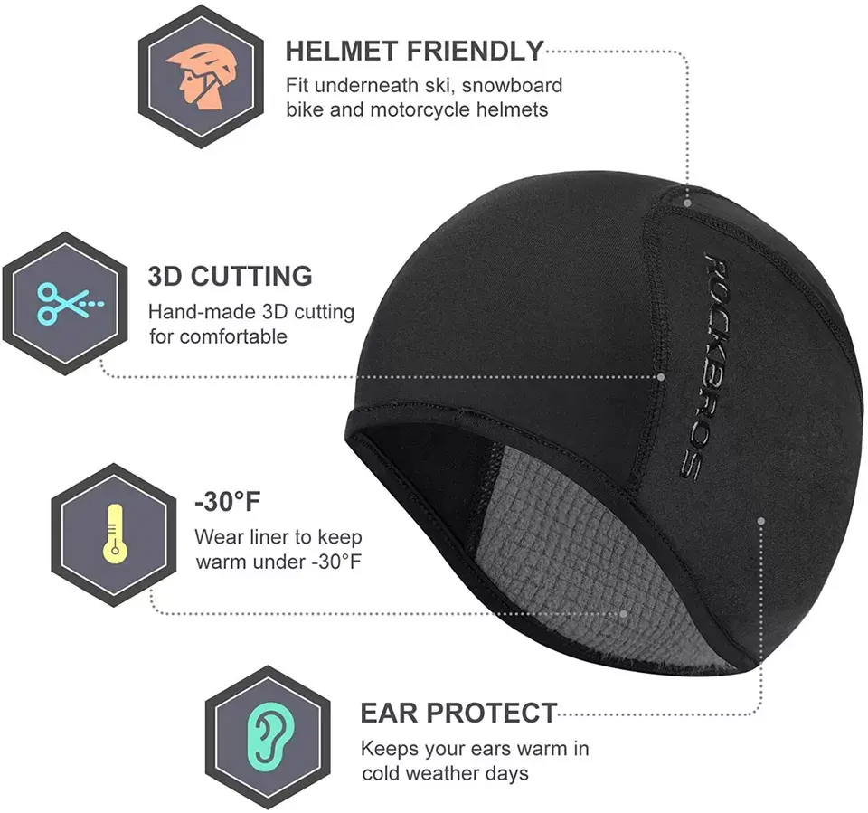 ·MULTI-APPLICATIONS:RockBros winter skull cap can be used in variety occasions--Helmet liner under ski cycling motorcycle helmet,winter running cap to get rid of bulky hat, fishing, Hiking, Snowboarding.More occasions to be found by you