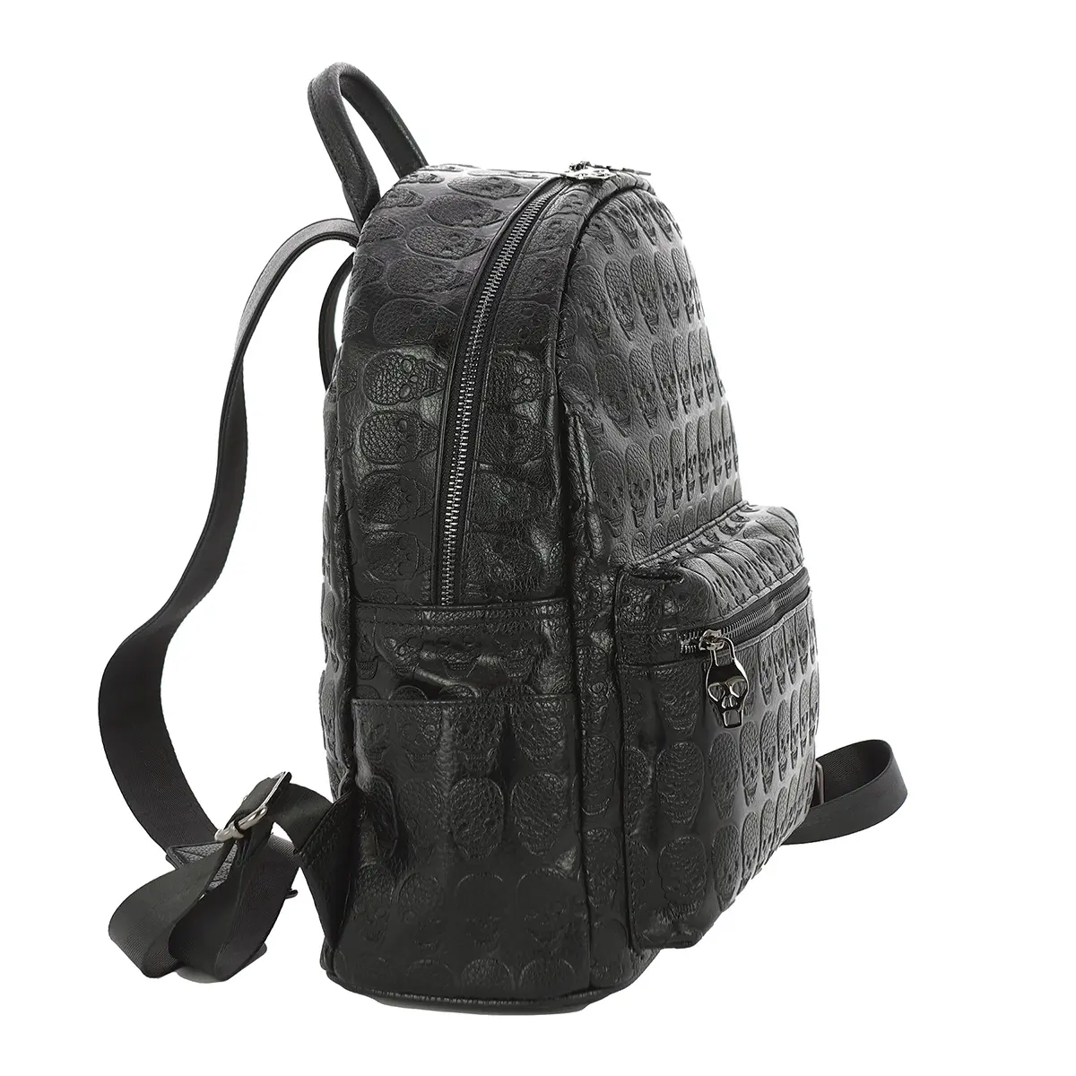 The Skull Pattern Faux Leather Backpack is a striking accessory that merges edgy style with practical functionality. Crafted from high-quality faux leather, this backpack boasts a luxurious look and feel while offering a cruelty-free alternative to traditional leather.