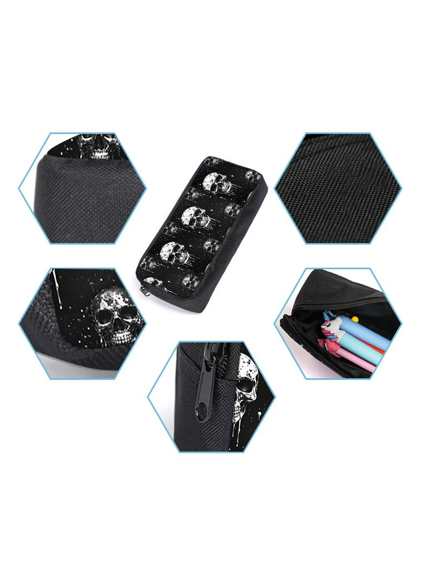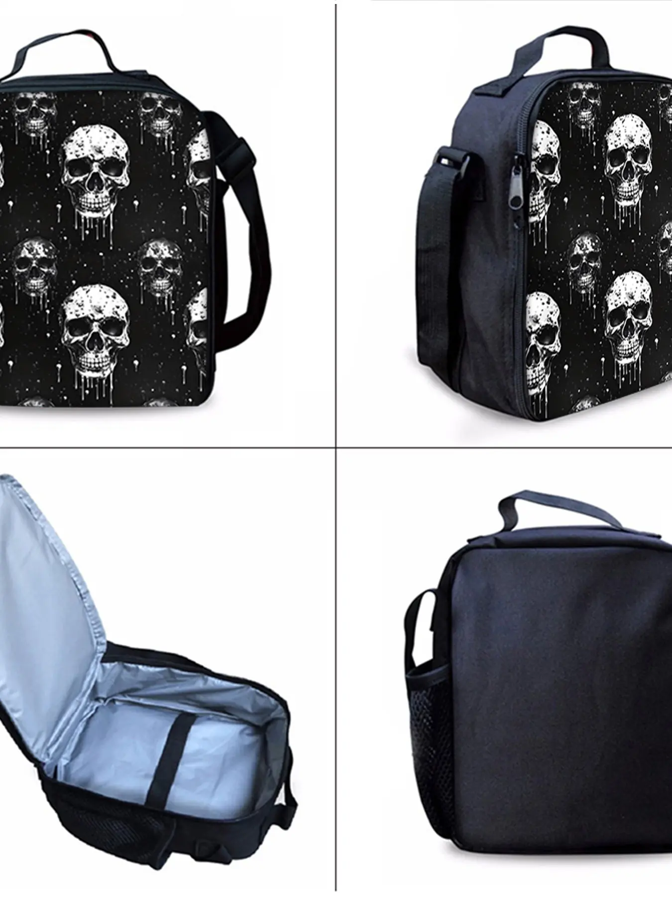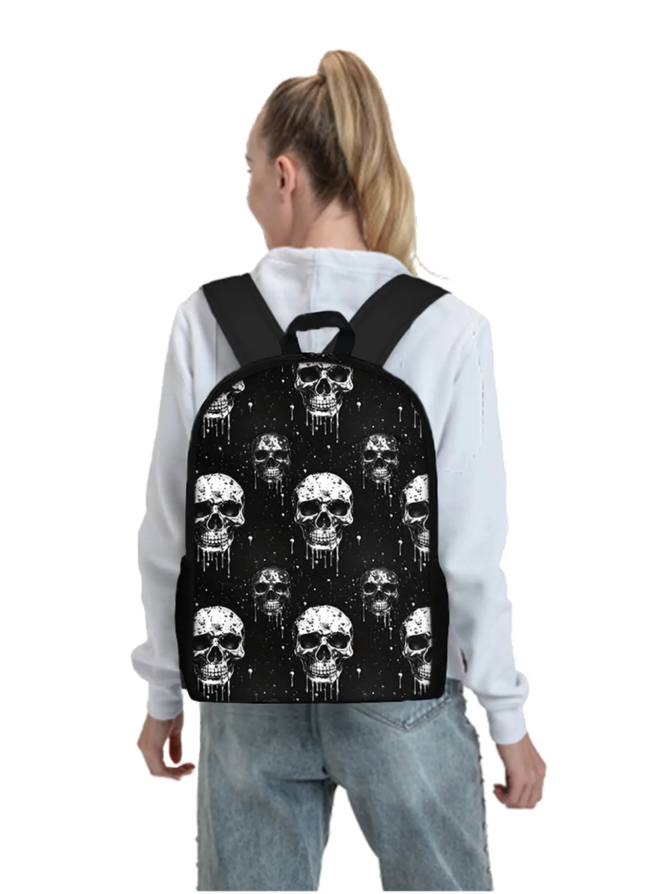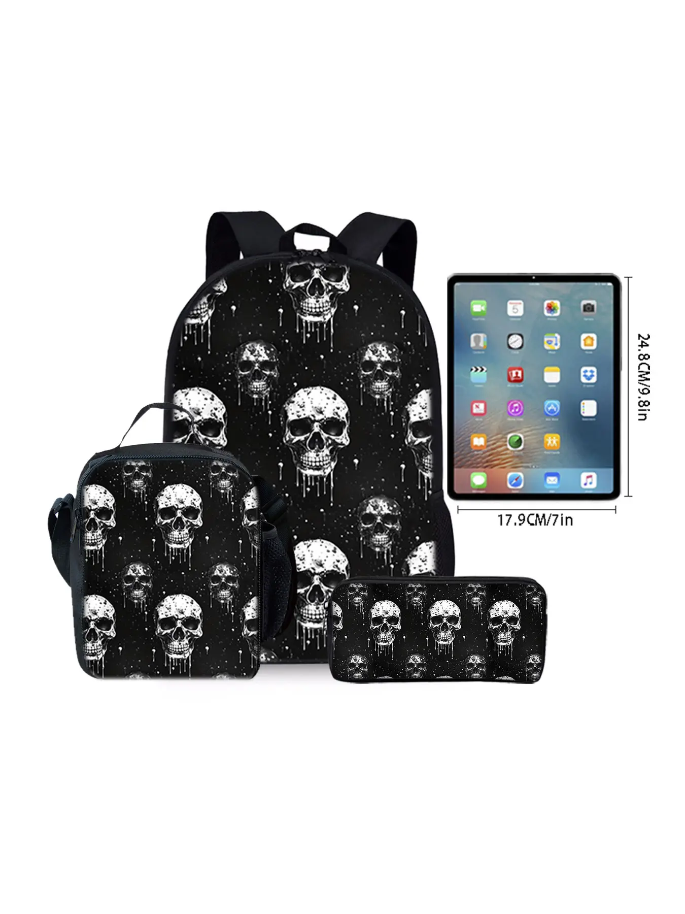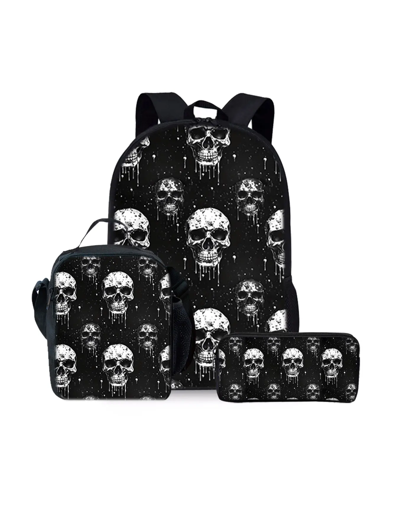 Skull pattern printed 17-inch backpack three-piece set (single-layer backpack + shoulder strap lunch bag + single-layer pencil case)