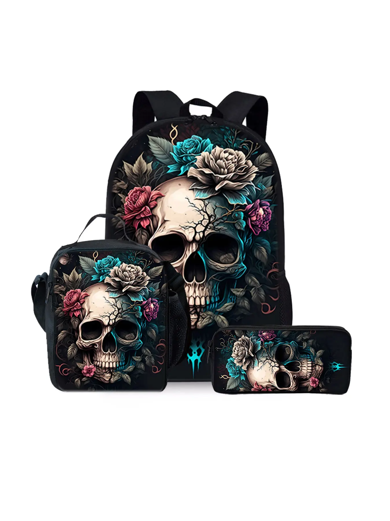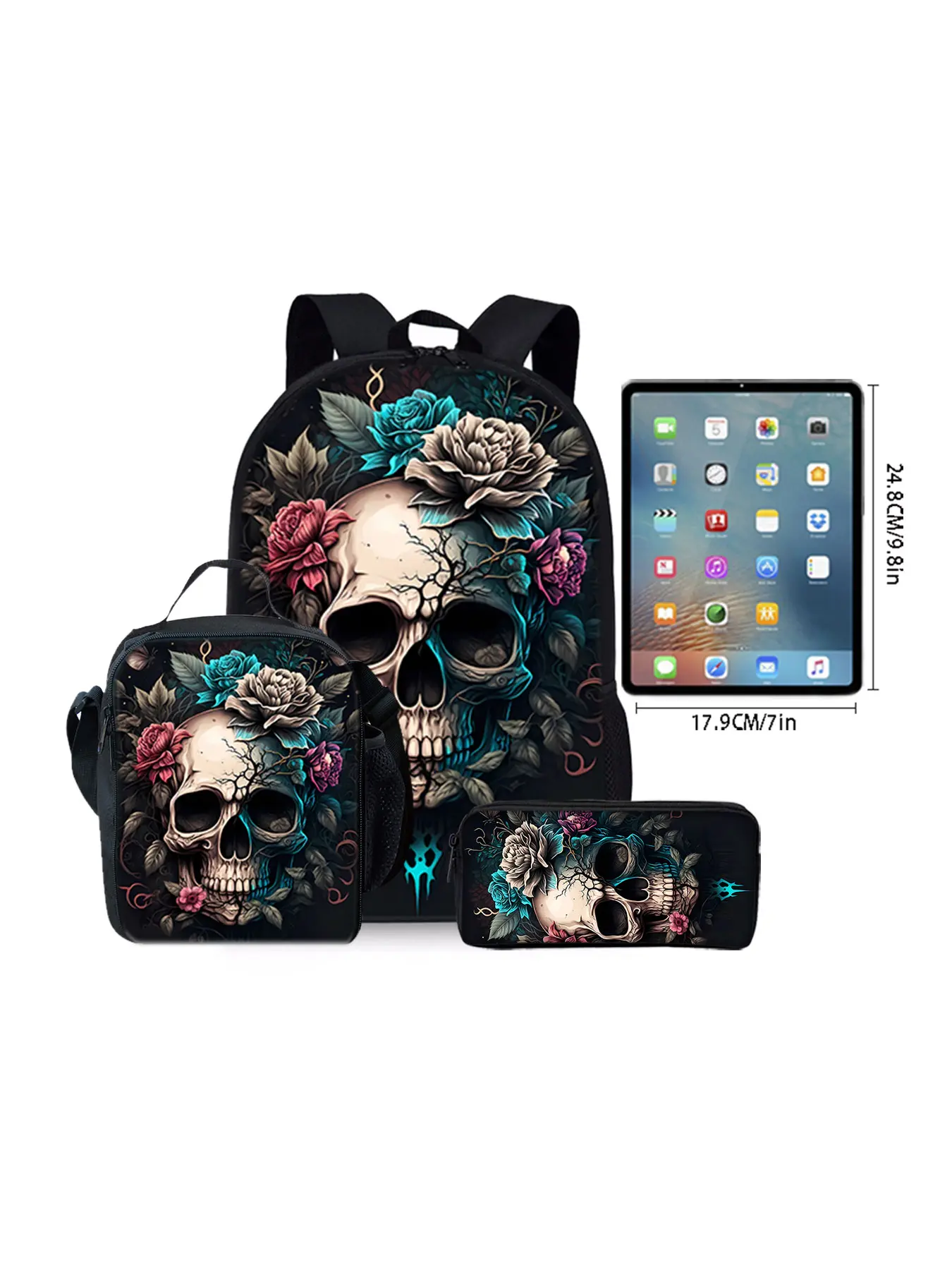 Skull pattern printed 17-inch backpack Casual Lightweight Backpack three-piece set (single-layer backpack + shoulder strap lunch bag + single-layer pencil case)