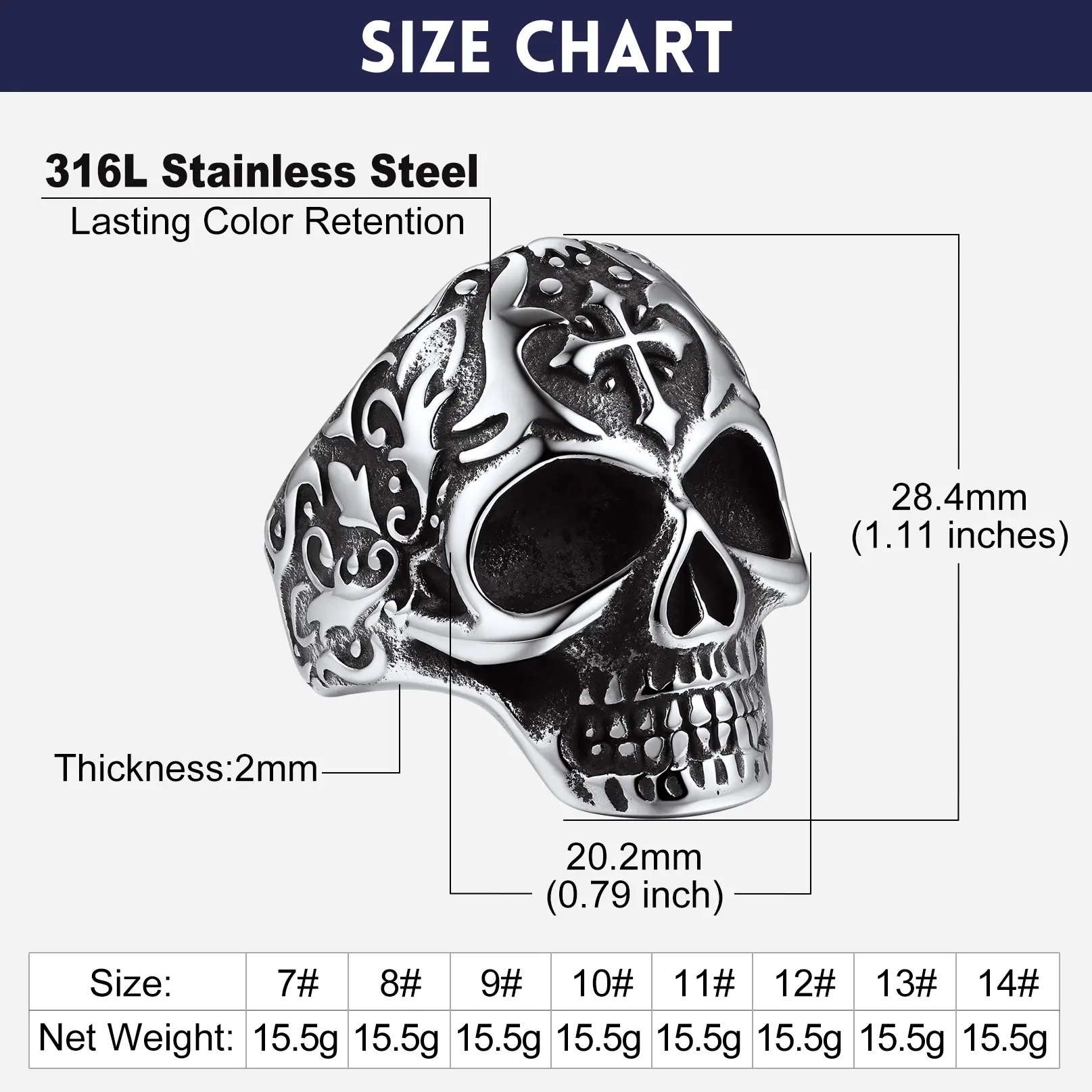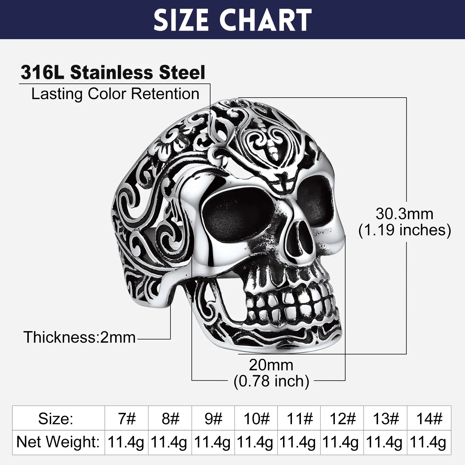 ·Dimension : Ring height: 18.5mm, width: 13.3mm, thickness: 2mm, net weight: 14.4g. We offer ring sizes from US 07-US 14.