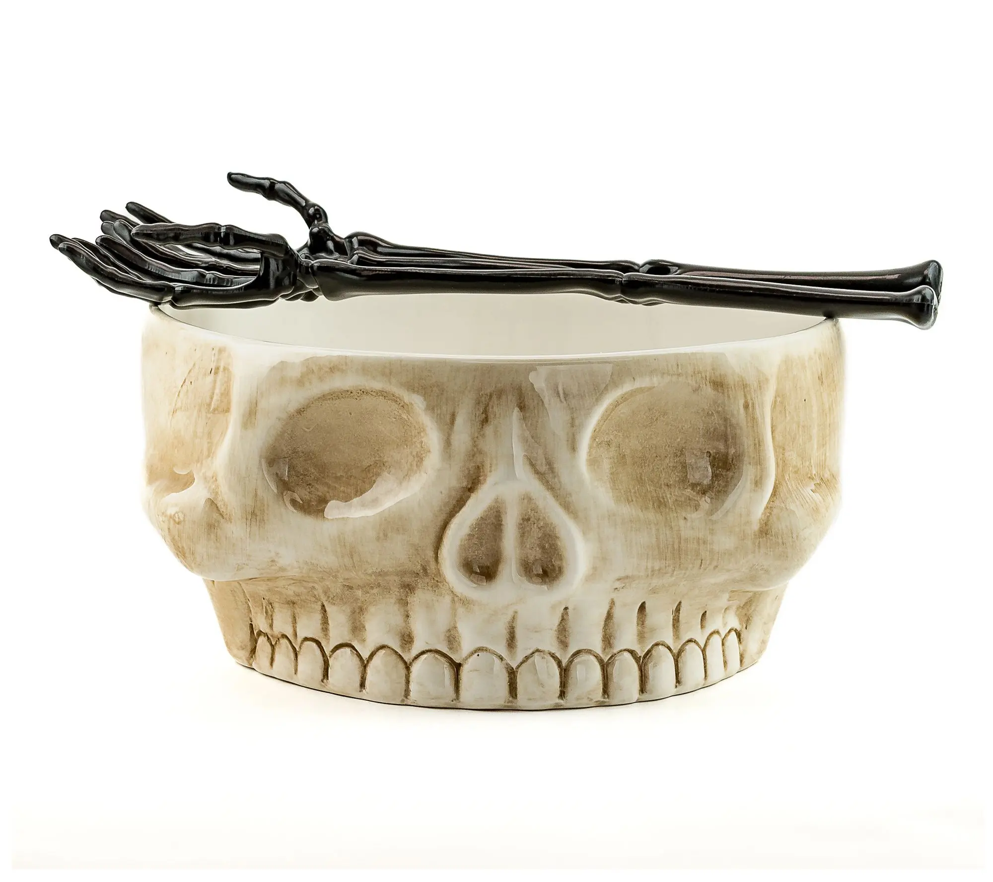 Bring a bit of spooky fun to your next gathering with this 10 Strawberry Street skull serving bowl. The ceramic design and skeletal serving utensils make every snack break or party spread an instant conversation starter, while the roomy size means you can serve chips, candy, or popcorn in unforgettable style. From 10 Strawberry Street.