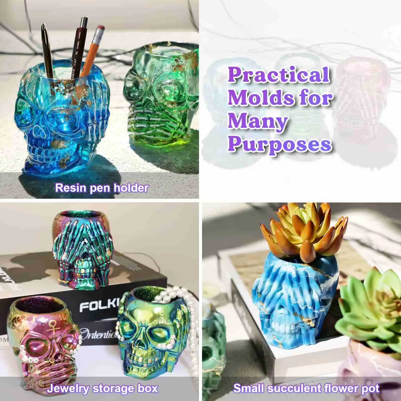 ¡ăVERSATILE USEăNot only are these resin silicone molds perfect for decorating, but they can also be used as jewelry containers, pen holders, and even as a stylish succulent flowerpot (just add fake succulents for a decorative touch). Whether you place it in your living room, study, or even at your workspace, expect heads to turn and conversations to start!