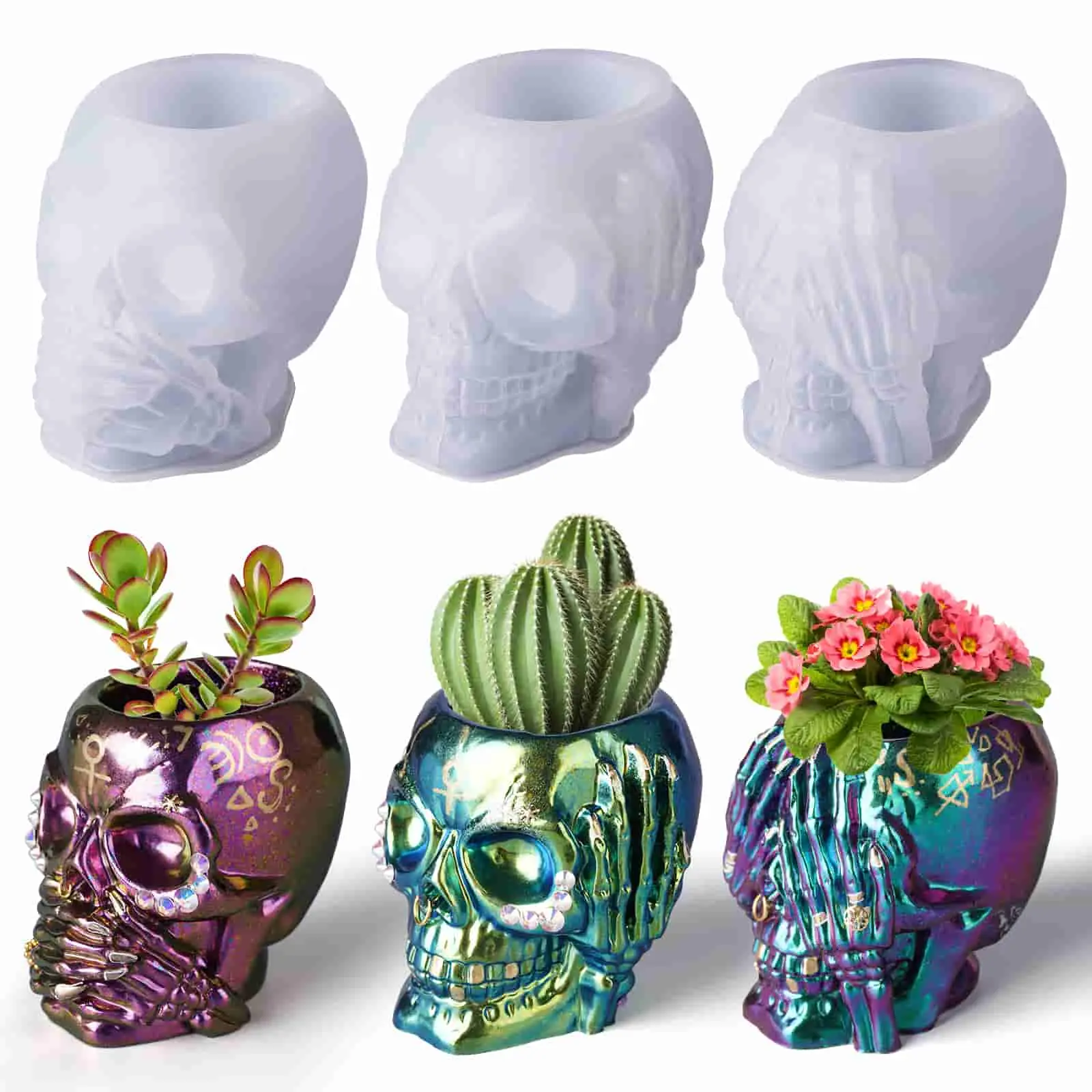 ¡ăADORABLE SILICONE SKULL MOLD SETăLook at these cute silicone molds skull, They are acting out the famous "Hear no evil", "See no evil", "Speak no evil". Their plump, mellow skulls and detailed fingers exude an ancient wisdom that makes them a standout decoration for your home.