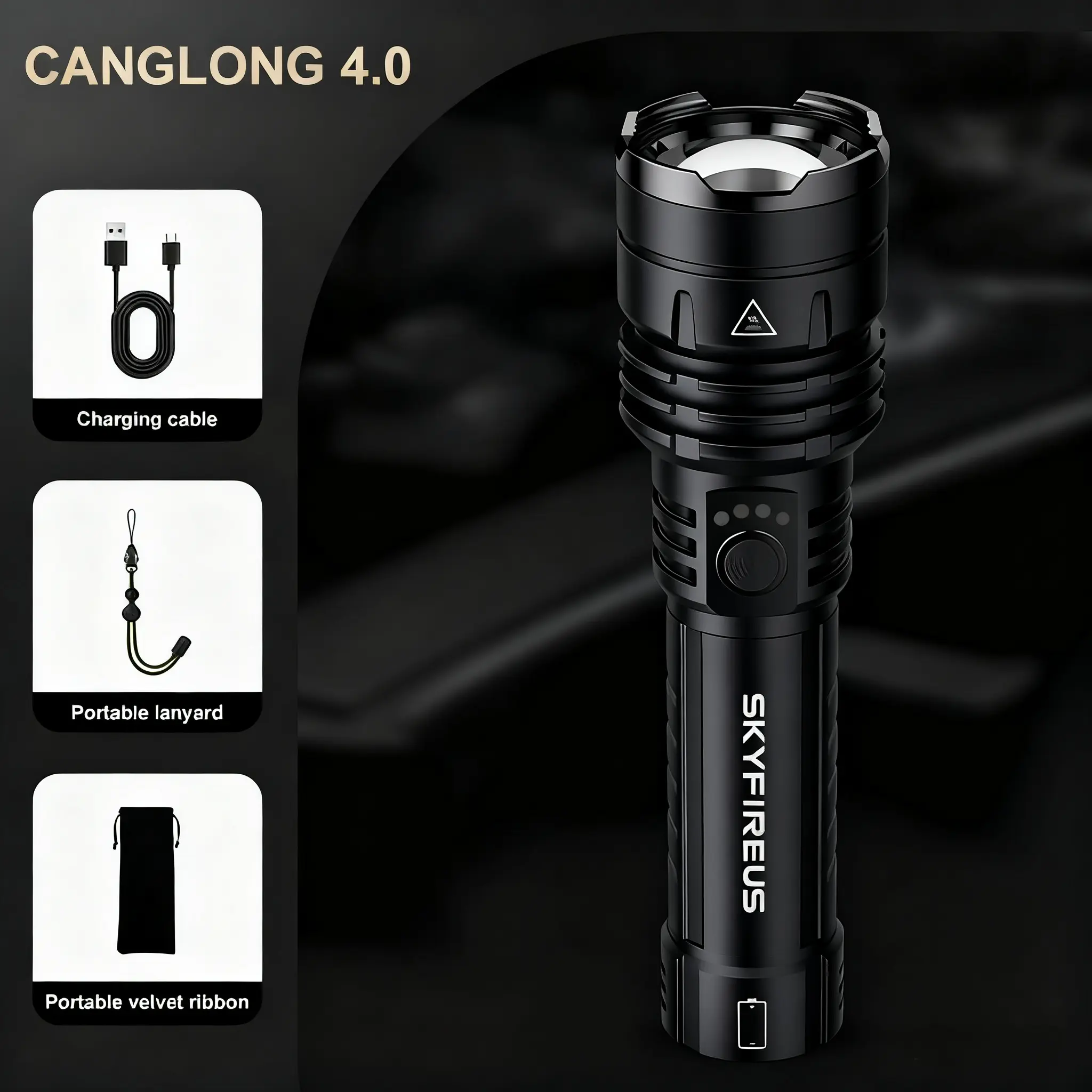 Illumination Distance: The strong light can reach over 1000 meters, and the light projection over long distances is concentrated. Waterproof Performance: It reaches the level of daily life waterproofing. The charging port is equipped with a rubber plug for both dustproof and waterproof purposes.