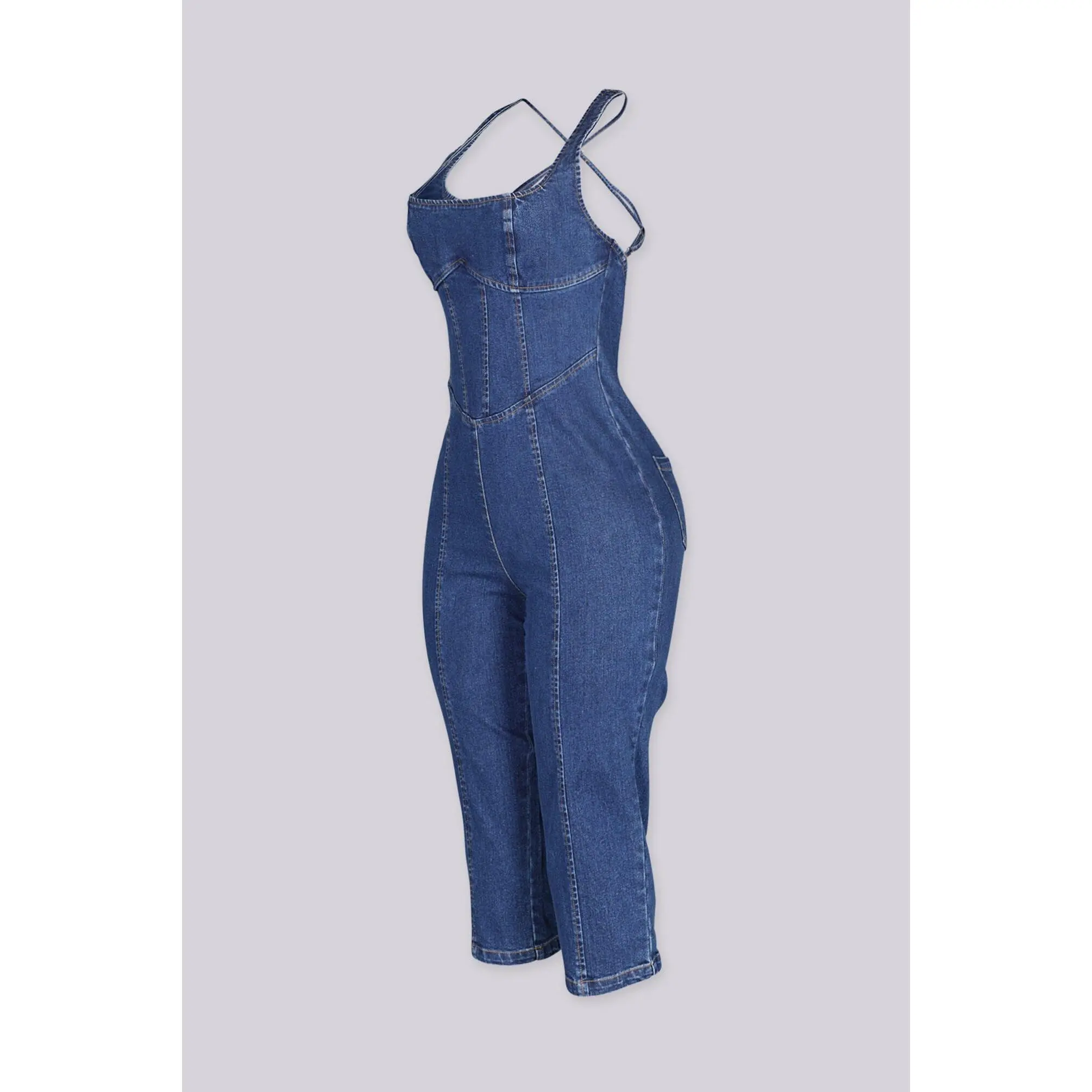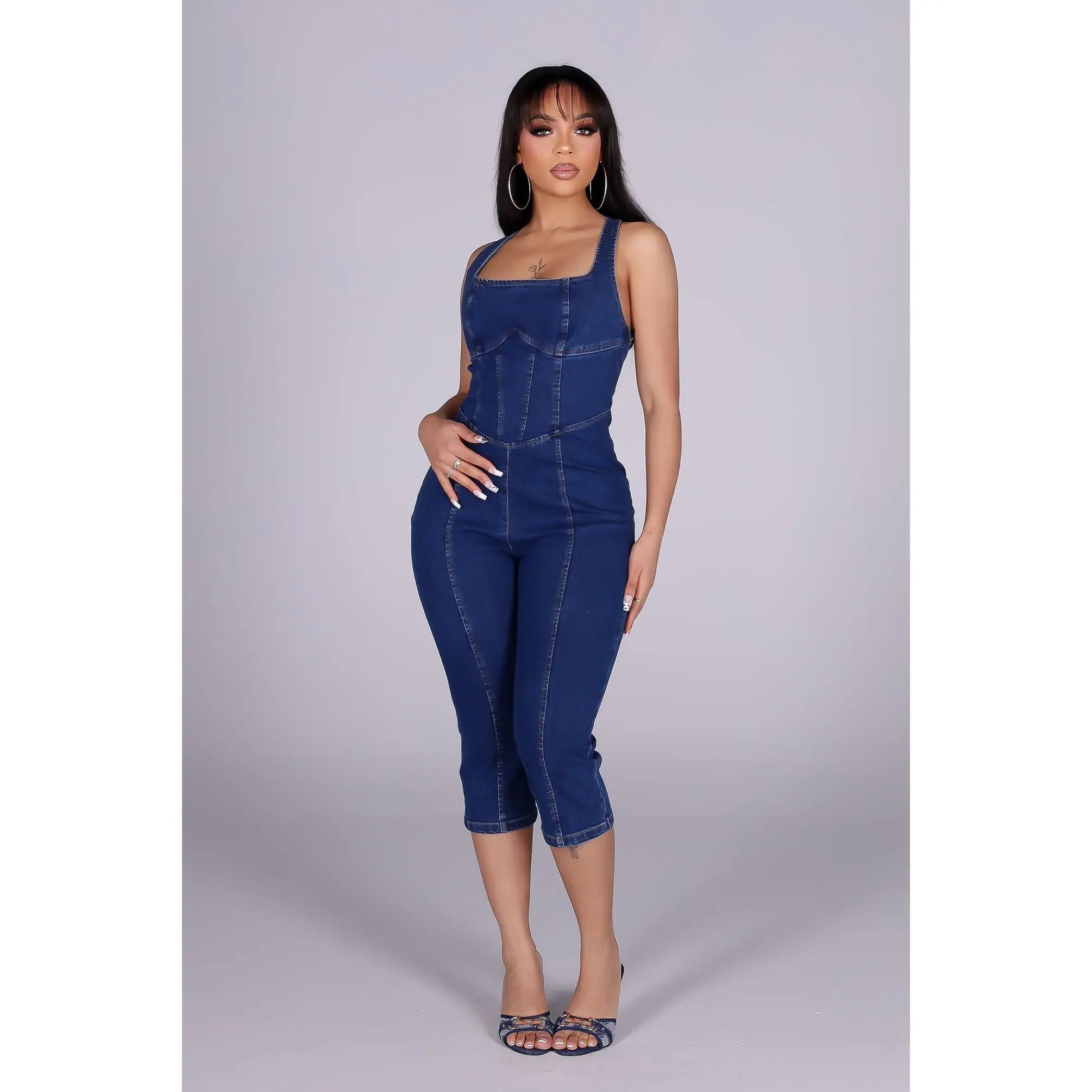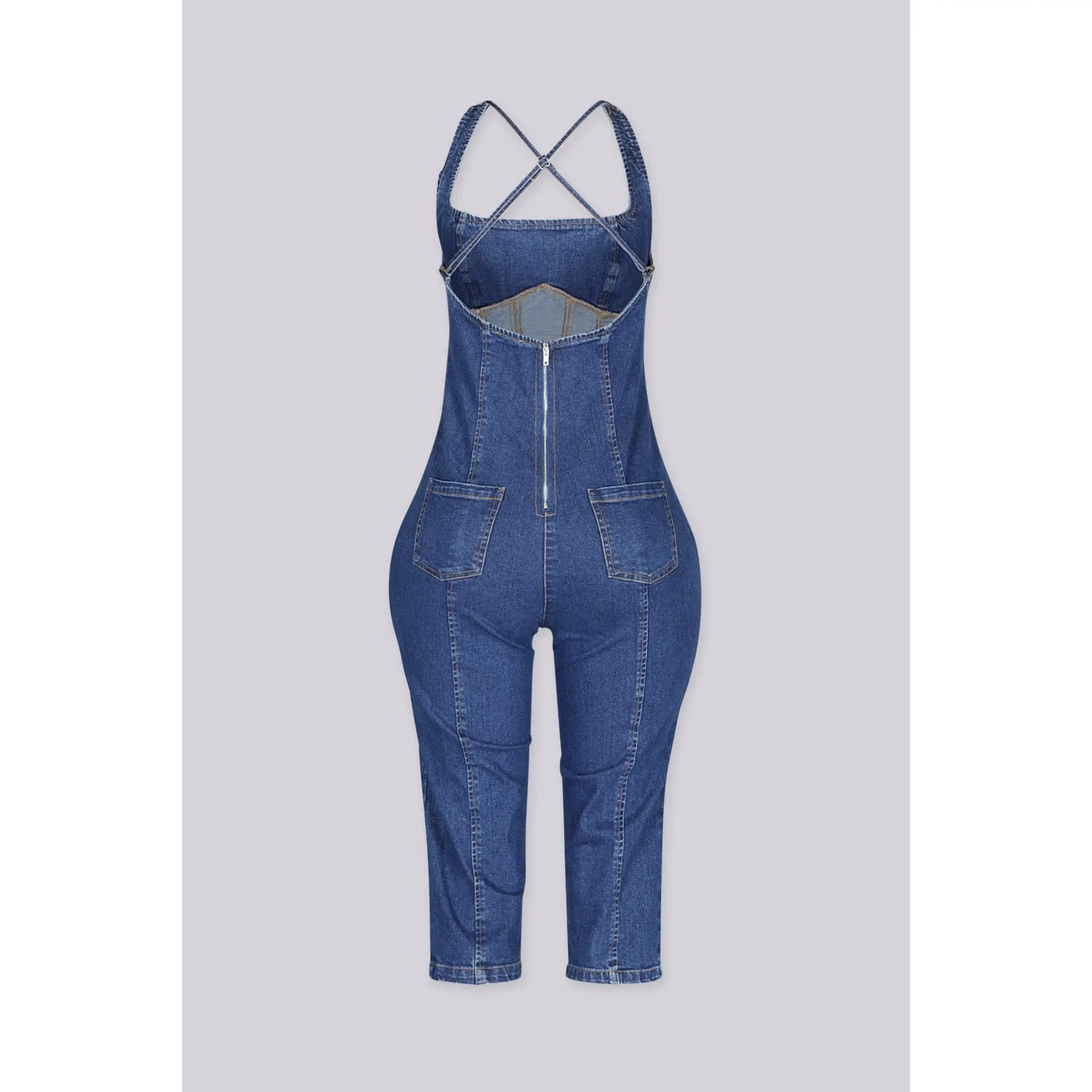 Dark denim capri jumpsuit with adjustable crisscross straps