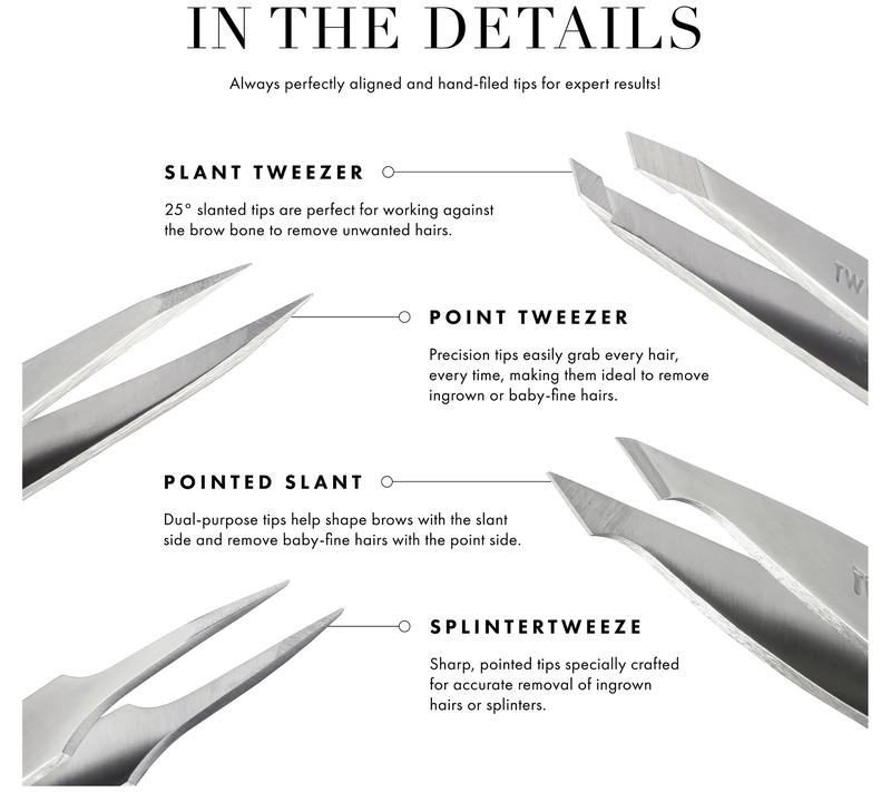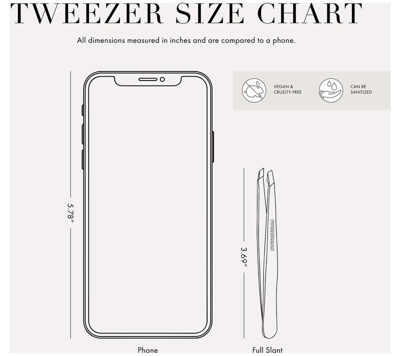 Expertly shape your brows with Tweezerman's classic Slant Tip Tweezer. A staple to your beauty routine and famous for its precision, the Slant Tweezer features perfectly aligned tips that grab every hair, every time and close evenly and firmly to remove hair from the root. Superior calibrated tension for comfort, control, and true precision. How do I use it: Prepare for hair removal by opening pores using a warm washcloth, not too hot to prevent redness. For maximum control, tweeze using your thumb and index fingers near the middle of the tweezer body. Grab the unwanted hair with the tweezer tips slanted at a 25-degree angle, squeeze down on the body of the tweezer, and pull in the direction of hair growth to remove hair from the root. From Tweezerman. Includes: