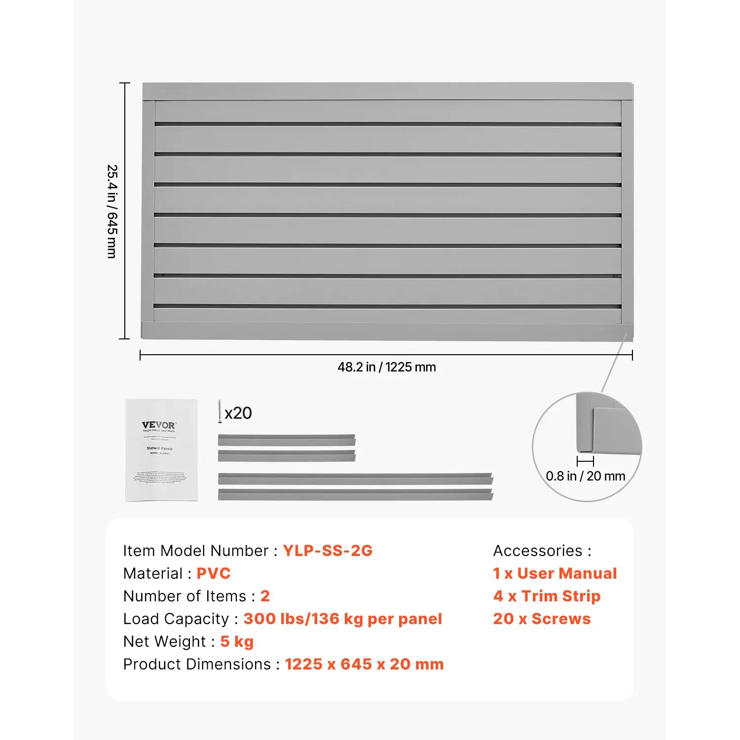• Strong Load-Bearing Capacity: The slat wall panel can support up to 300LBS/4ft², providing stable and efficient storage for various heavy items such as hammers, drills, ladders, and more, making it ideal for use in garages, workshops, and other spaces.