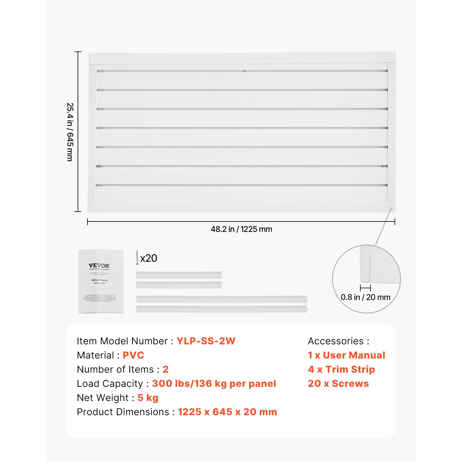 VEVOR Slat Wall Paneling,  2 x 4 ft, PVC Garage Slatwall with Modular Design, White Slat Wall Easy-to-Install Adjustable Slatwall Panel with Coupling Structure & DIY Cutting, Fits for Storage & Display
