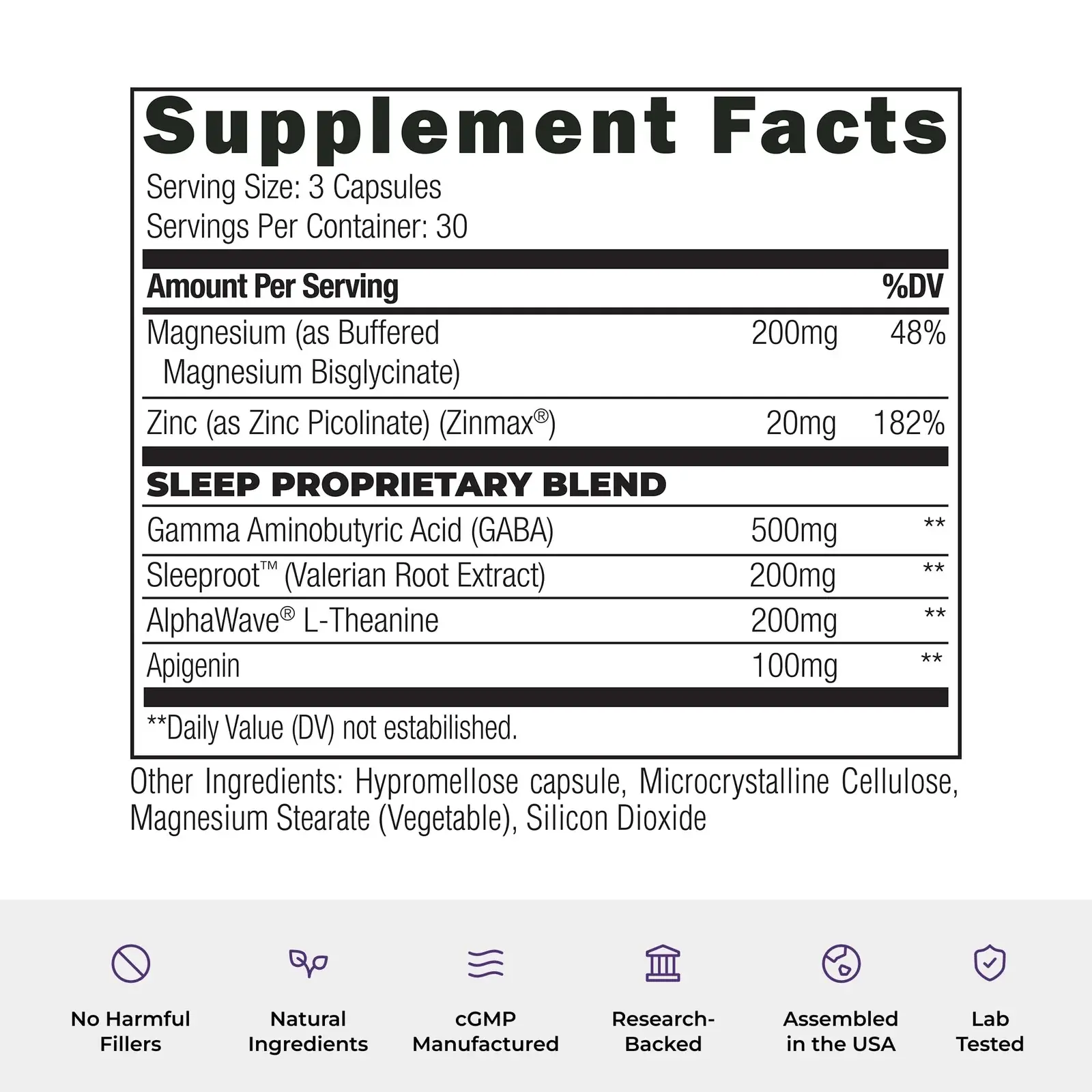 ·Relaxation & Mood SupportIncludes GABA, Magnesium Glycinate, Valerian Root, L-Theanine, and Zinc to support relaxation and a balanced mood before bed.