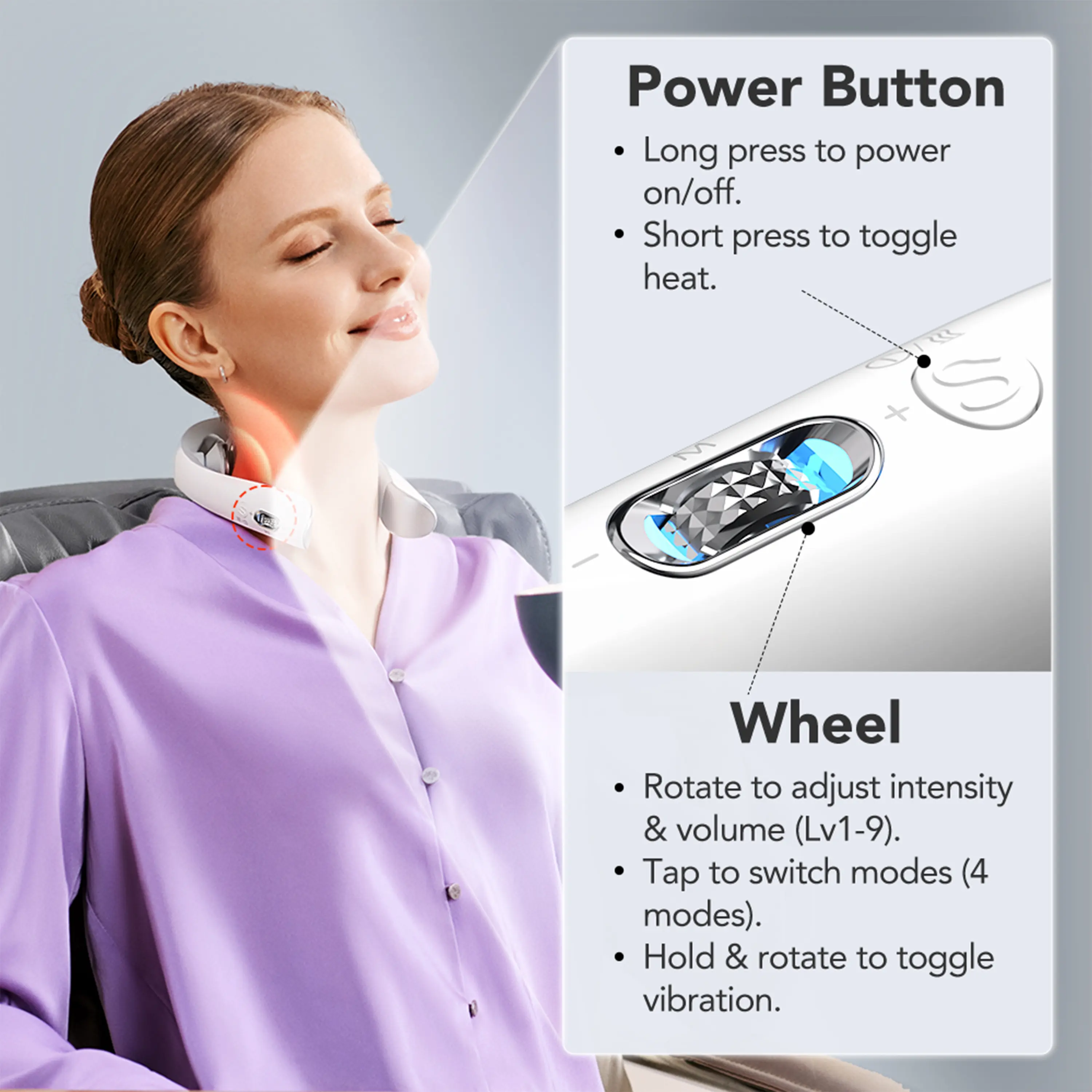 As some with severe neck and back injuries I needed something portable and comfortable. I had a tens machine prior but with all the wires, I was forced to sit still. Beyond the portability, it heats up fast (3 settings) and the control wheel for power levels is easily accessible. Works like a charm!
