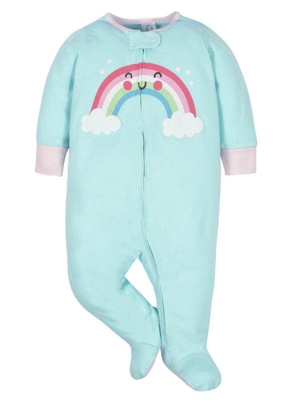 This 4-pack of baby girls' Sleep N' Plays from Gerber offers the best in comfort and convenience. The smart design makes these garments ideal for both active play and relaxing. Each one is made from 100% cotton jersey for a cool, breathable feel. A zip front opening makes it easy to change diapers. Getting her ready in the morning is as simple as sliding her into the Sleep N' Play and zipping it closed. Her chin stays safe from zipper scratches with the soft tab cover at the neck. The assortment of themed screenprint and puff print designs add a creative look. These garments clean up quickly with the machine wash and dry fabric!