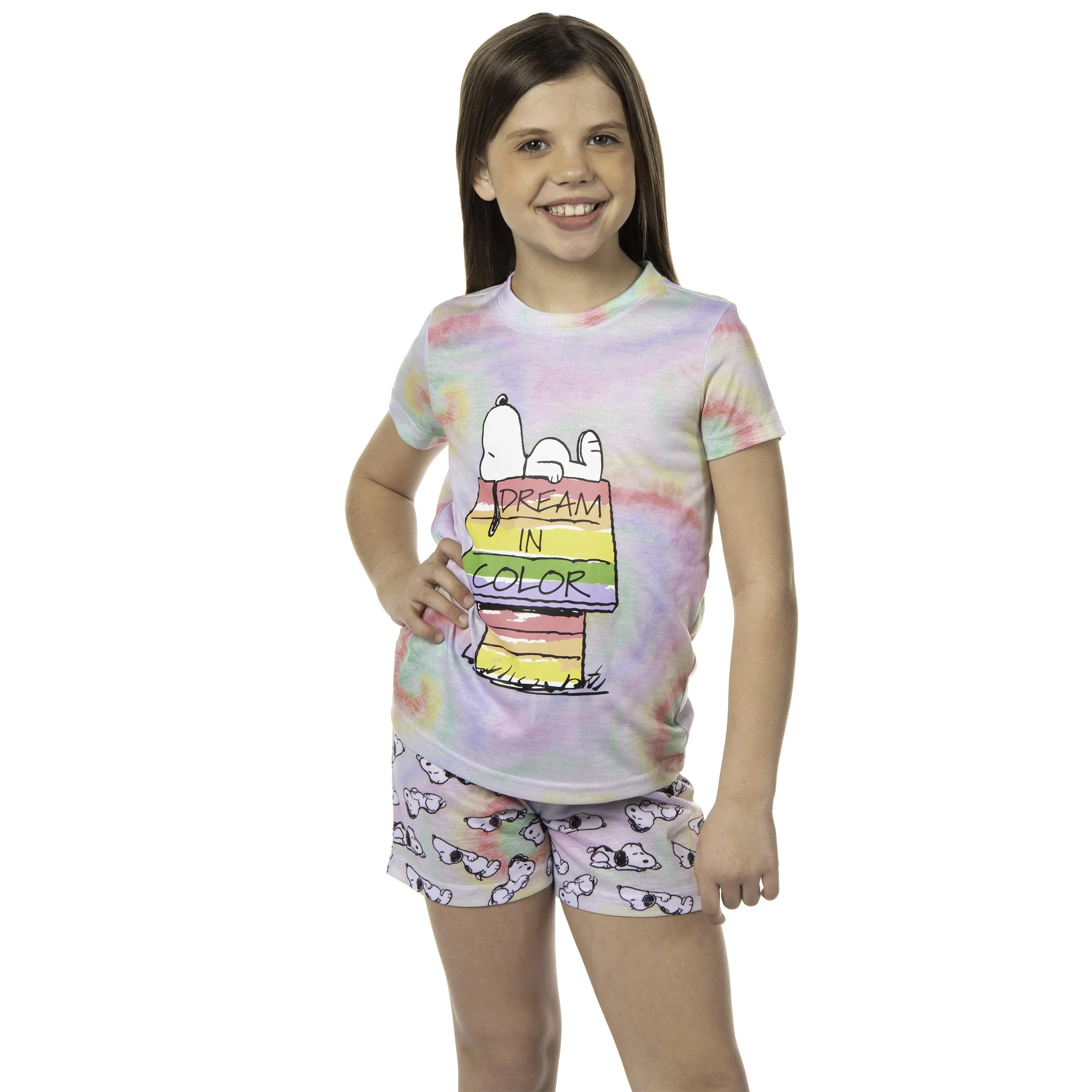 In 1950 Charles M. Schulz introduced a clever comic strip about a young boy named Charlie Brown and Snoopy, the coolest Beagle dog around, along with great characters like Lucy, Linus Van Pelt, Patty Peppermint, Pigpen, and more! Soon the comic strip spawned multiple hit cartoons, like A Charlie Brown Christmas, It's The Great Pumpkin, Charlie Brown, Charlie Brown's All-Stars, and, Be My Valentine, Charlie Brown. This pajama set-top features Snoopy laying on his rainbow doghouse with the words "Dream in Color." The shorts feature a tossed print of a sleeping Snoopy, and the whole pajama is a fun rainbow tie-dye. This cute PJ short set is made from soft breathable 100% polyester. MERCHANDISE - Intimo specializes in top-notch, sleepwear for men, women, boys, and girls. Intimo is the industry leader in pop culture products and apparel that deal with the entertainment industry in comic books, tv shows, movies, music, sports, and what's trending. SIZING / SOFT FABRIC BLEND - This pajama short set is made from soft breathable 100% polyester.. It is listed in girl's sizing. Our model is 50 inches tall and is wearing a size 7/8. CLASSIC CHARACTER DESIGN - This pajama set-top features Snoopy laying on his rainbow doghouse with the words "Dream in Color." The shorts feature a tossed print of a sleeping Snoopy, and the whole pajama is a fun rainbow tie-dye. They're great for everyday wear! FEATURES - The set features an elastic stretch waistband on the shorts and a classic crewneck fit on the top! great GIFT FOR ANY OCCASION - Magnificent design for everyday use. This pajama set is designed for your little kiddo in mind, and its soft and comfy fit is great for everyday wear and curling up to dream about hanging out with the Peanuts crew!