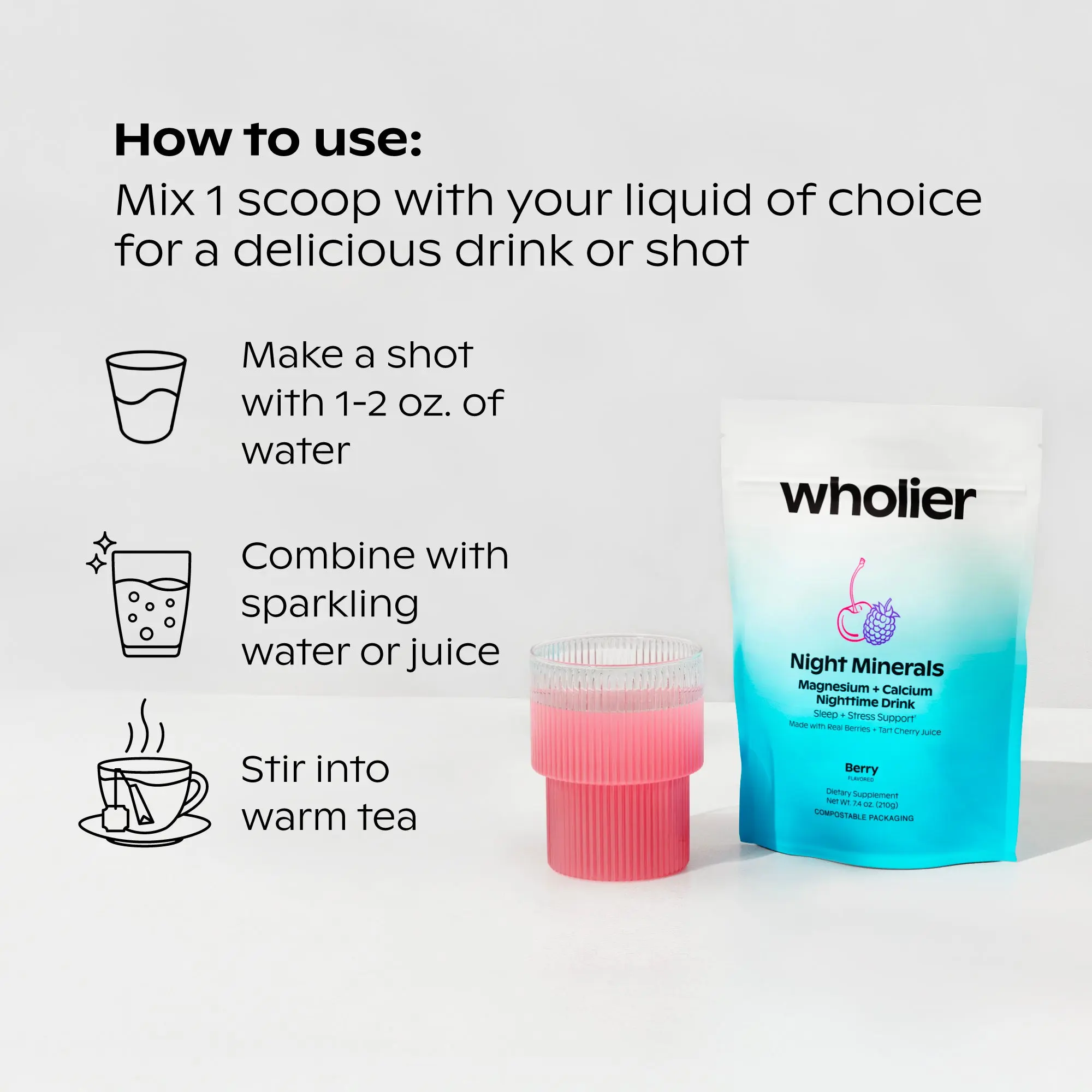 Mix one scoop with warm or cold water and enjoy 1-2 hours before bed. Use nightly as part of your wind-down routine. Store in a cool, dry place.