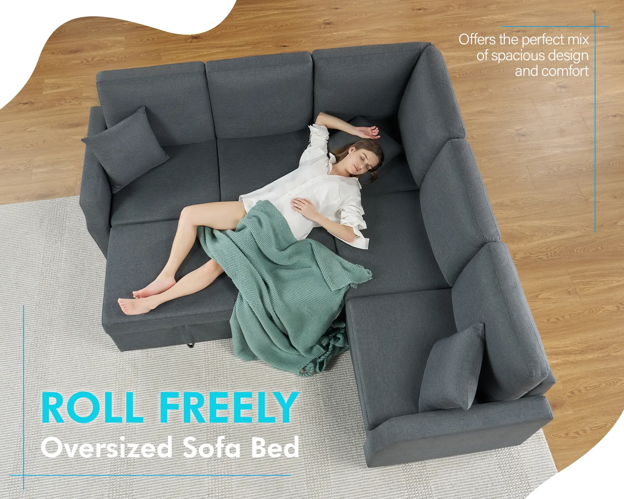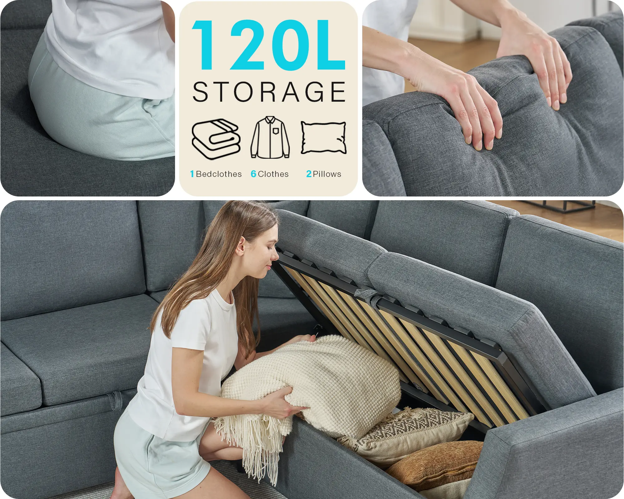 SLEEPER COUCH The perfect combination of functionality and style, convertible couch bed is designed to meet the demands of modern living. As well as providing luxurious place to stretch out and relax, the recliner has spacious storage compartment hidden underneath. Cloud couch hidden storage area is perfect for storing blankets, cushions or other essentials to keep your living space tidy and clutter-free. A must-have for your home. Needless to say, our sectional sofa for living room brings warmth and elegance to your space that you are sure to love. Don't hesitate to enjoy oversized couch now. Product Features: 1. Pull out sofa bed. 2. High resilience foam cushions and plush backrest. 3. Storage seat. 4. Sturdy and durable solid metal frame. Fabric Material: Linen Recommended Place - Living room - Bedroom - Office - Apartment - Entertainment room Dimensions: -Height: 36 inch -Width: 85 inch -Depth: 33 inch