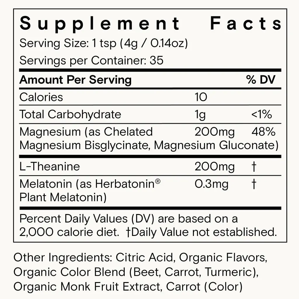 ·Cherry: Magnesium (as Magnesium Bisglycinate, Magnesium Gluconate), L-Theanine, Herbatonin® (Plant Melatonin), Citric Acid, Organic Flavors, Organic Color Blend (Beet, Carrot, Turmeric), Organic Monk Fruit Extract, Carrot (Color)