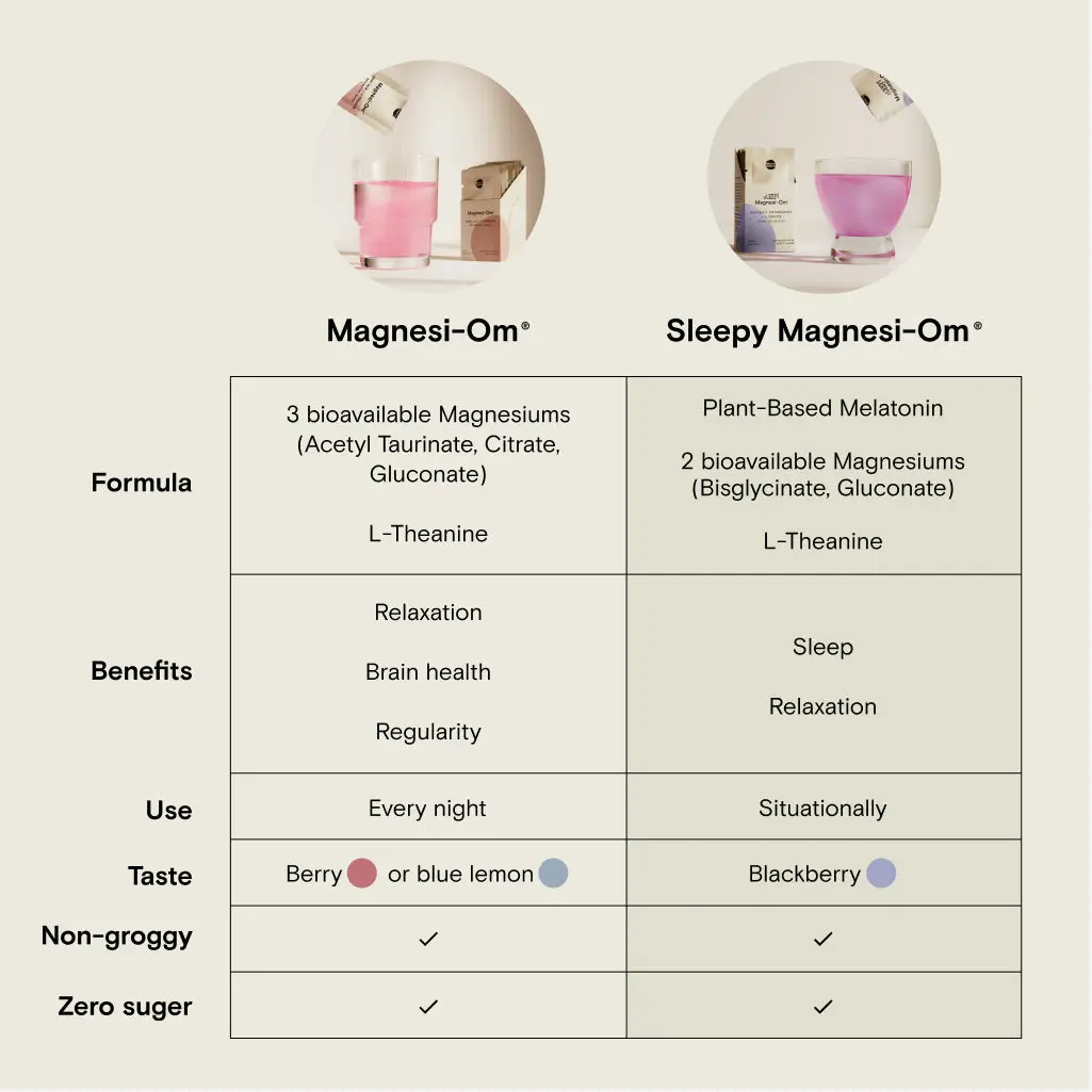 Melatonin regulates circadian rhythm. Unlike higher-dose melatonin that leaves you groggy in the morning, Sleepy Magnesi-Om® supports slumber without the hangover.* Our microdose of plant-based melatonin, extracted from organically grown alfalfa and chlorella, decreases duration to fall asleep.* Chelated, non-laxative magnesium bisglycinate and gluconate support the body’s stress response and relaxation.* L-theanine supports sleep quality.* This melatonin and magnesium sleep supplement instantly dissolves in water, tastes like organic blackberries or cherries (depending on your pick), and has zero sugar.