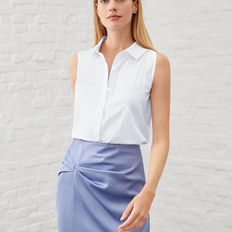 ·This sleeveless blouse features a shirt collar and full-length button panel. The slightly rounded hem adds a touch of elegance. Crafted from crisp poplin, it offers a semi-fitted silhouette. Perfect for professional women, it's ideal for hot days or layering under a top. Tuck it into high waisted skirts for a professional look or pair it with jeans for a casual vibe.