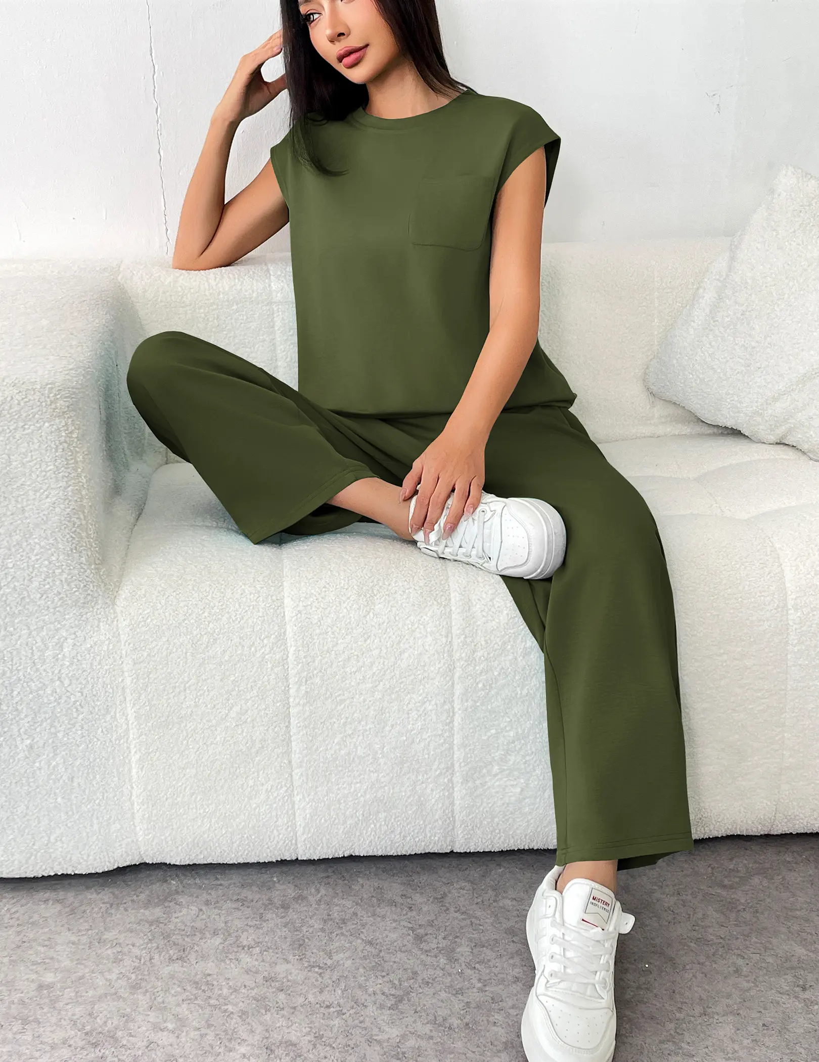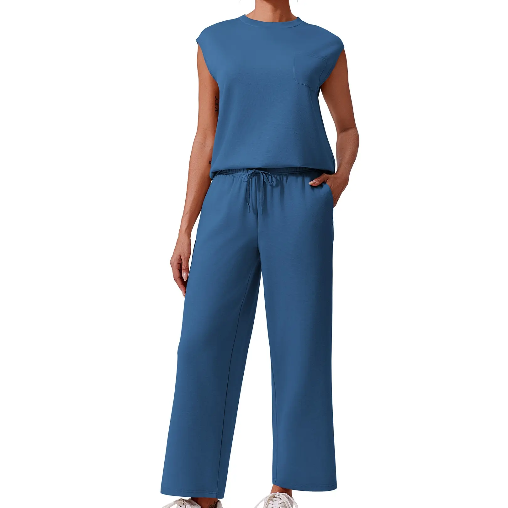 ¡Cropped Wide-Leg Pants: The bottoms are designed as 9/10 length wide-leg pants, hitting just above the ankle. They come with an adjustable drawstring waist for a customized fit and optimal comfort.