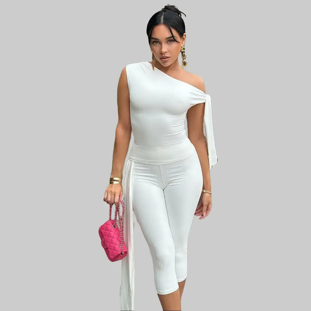 5. Solid Slanted Neck Lacing Design Sleeveless Top & High Waist Cropped Pants Two-Piece Set Women 2025 Summer New Casual Sexy with Ribbon Elegant Party Club Clothing Outfits