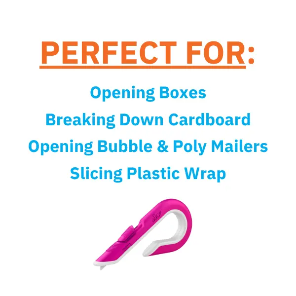 The Slice Box Cutter simplifies package opening! Its ceramic blade is safer than metal and never rusts. Ideal for opening boxes, bubble mailers, and breaking down recycling. 🌟