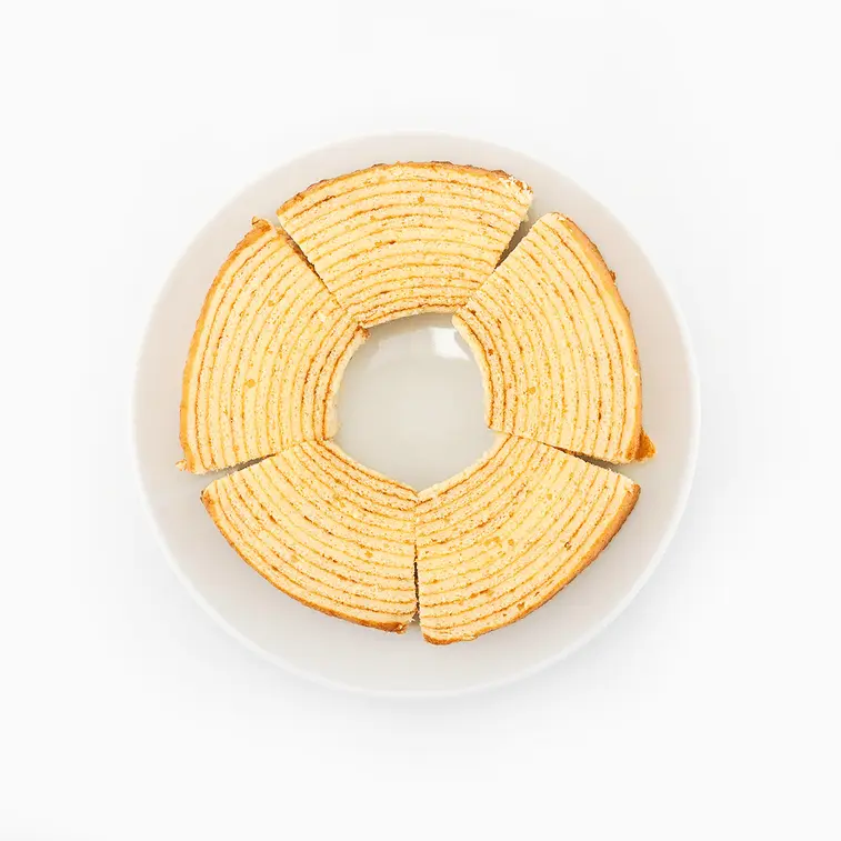 Experience the indulgent taste of our MARUKIN Sliced Cheese Baumkuchen, a thick and moist layered cake that is perfect for baking enthusiasts.