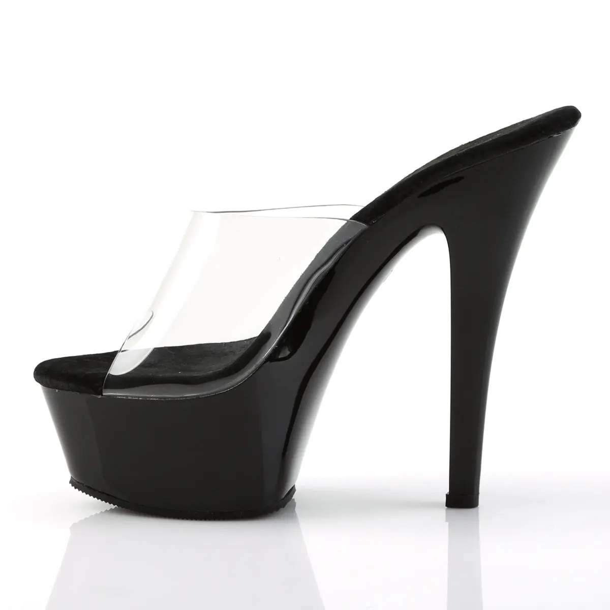 Step into elegance with the Kiss-201 Peep Toe Slide. Featuring a striking 6-inch heel and a 1 3/4-inch platform, these slides effortlessly combine height and allure. The clear upper and sleek black accents offer a modern, chic look perfect for anyone wanting to make a bold statement. Ideal for both performances and nights out, the Kiss-201 adds a touch of glamour to any outfit.