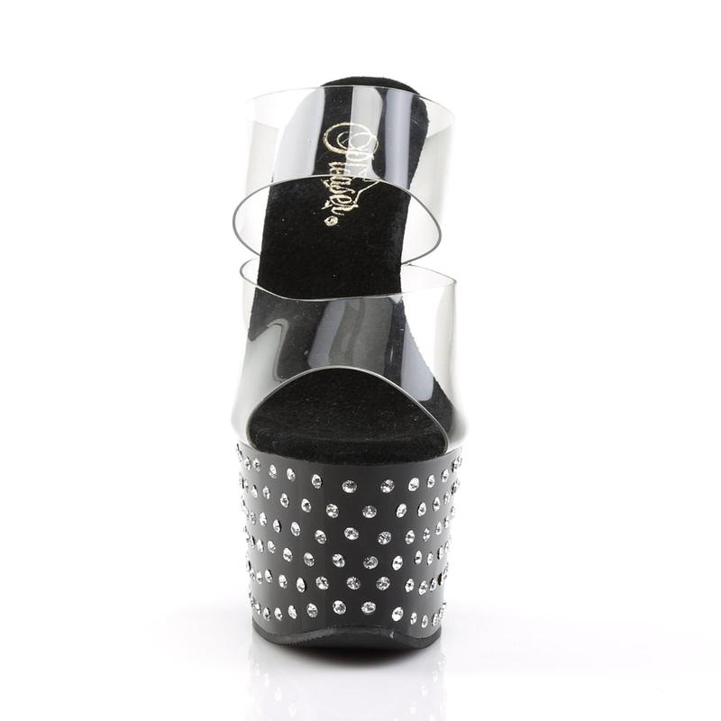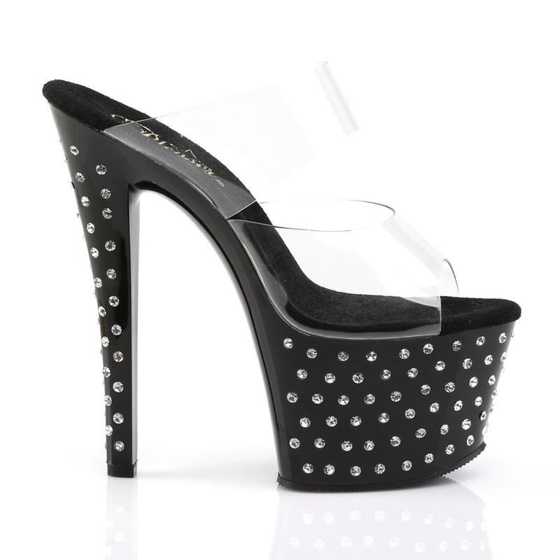 Step into the club in bold style with the Pleaser STARDUST-702 stripper heels. These sexy two-band clear slides feature a black rhinestone-studded platform, designed for exotic dancers and pole performers who love effortless glamour.