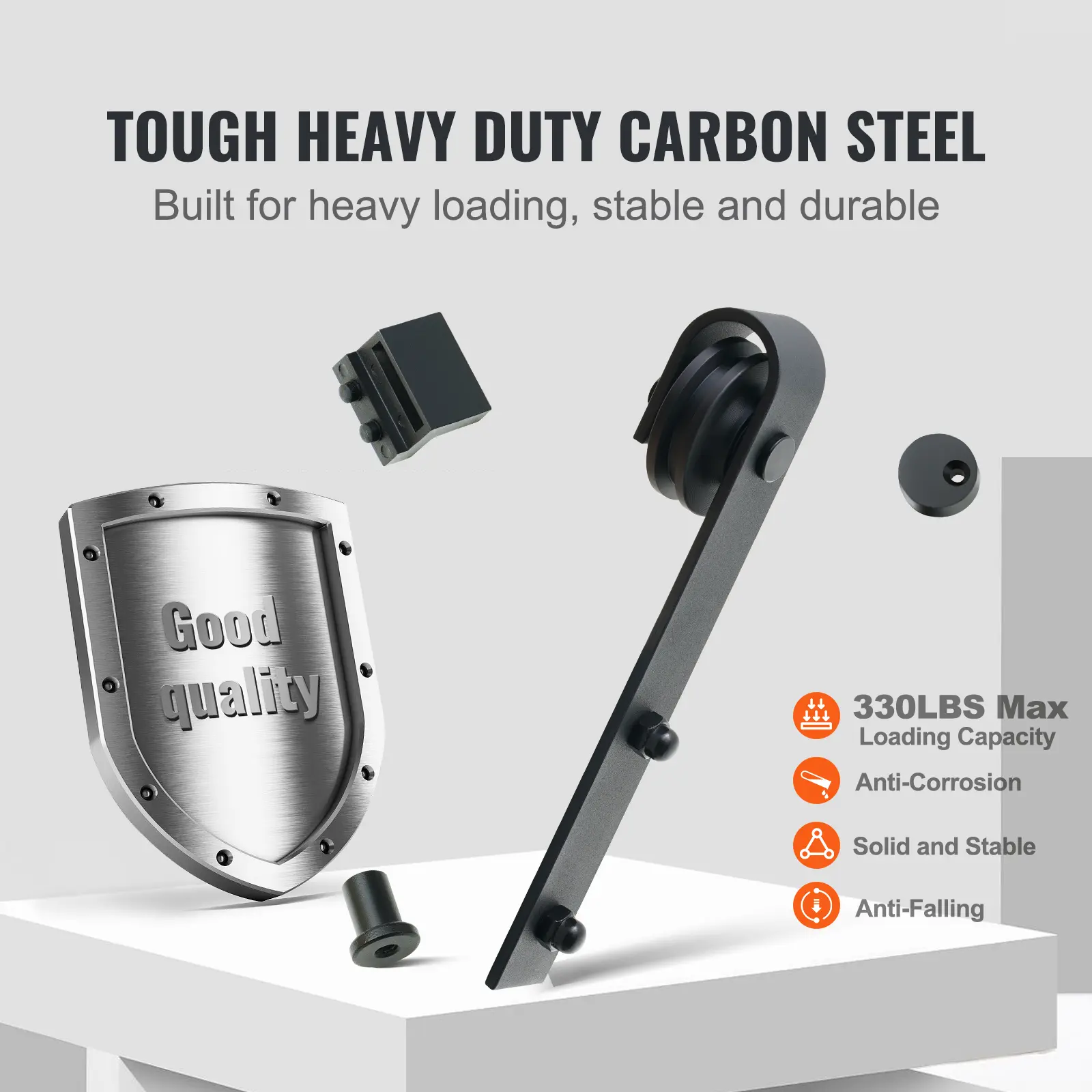 • 2-Section Tracks Sliding System: VEVOR 8ft J-shaped sliding barn door hardware kit comes with 2-section tracks, making the assembly exceptionally simpler and safer. This heavy duty barn door hardware kit can easily hold up the barn door track without shaking, while the low clearance barn door hardware system requires less space above the doorway, both stable and space-saving!