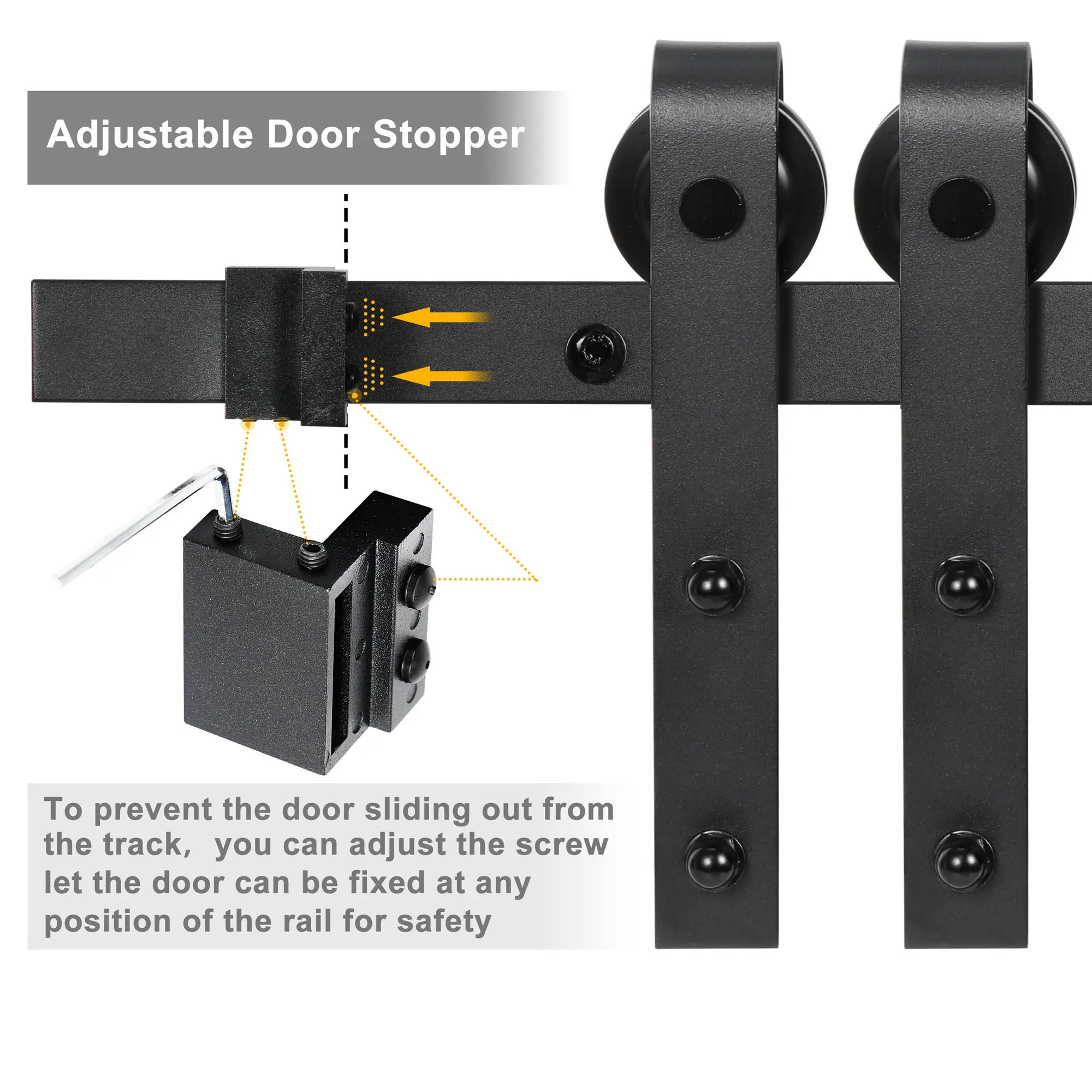 Β·Safe Stoppers: 2 doorstops on the track ends prevent the pulley from rolling off the track; Doorstops can be located freely along the track according to your needs; Each stop features 2 rubber dots as buffers and silencers.