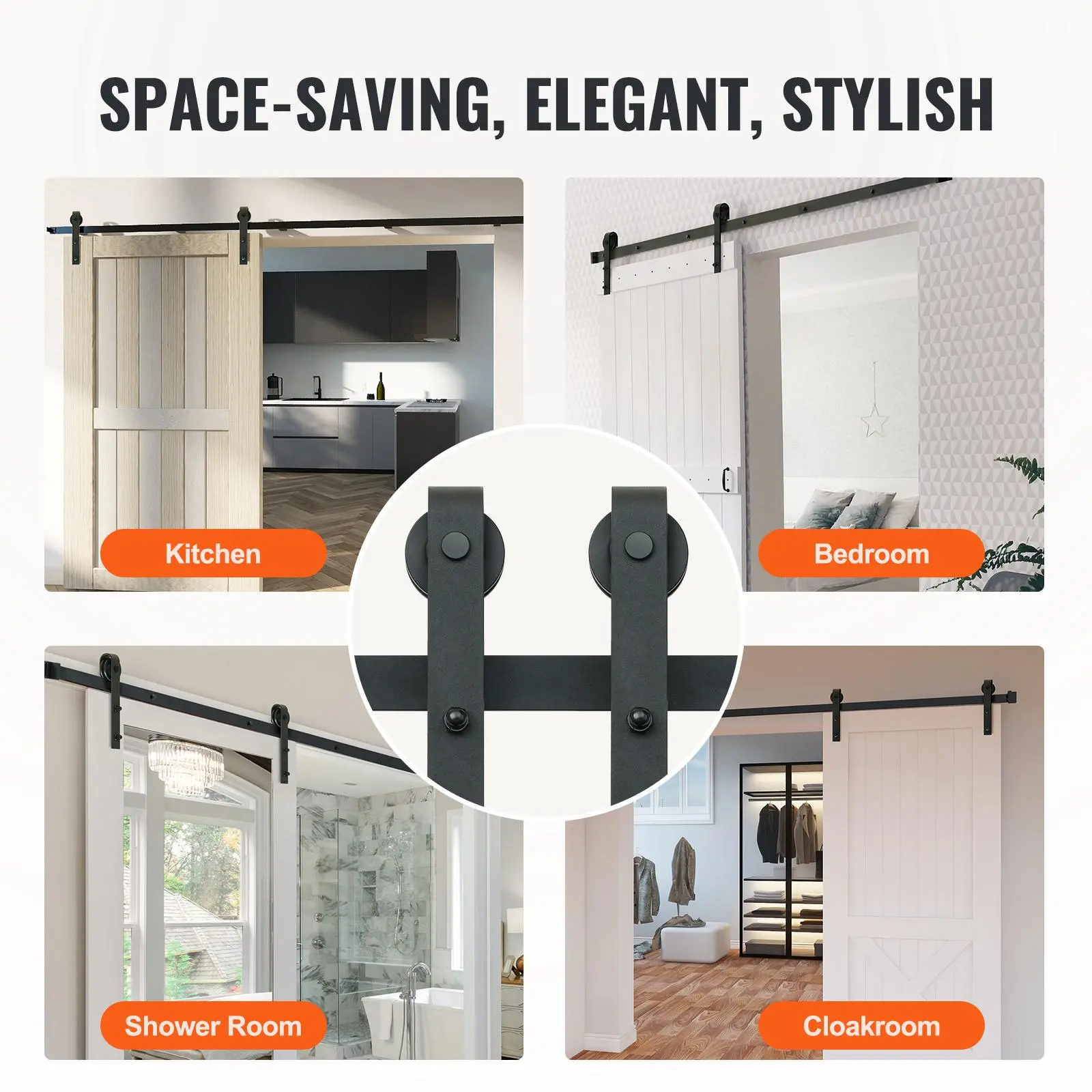 • 2-Section Tracks Sliding System: VEVOR 8ft J-shaped sliding barn door hardware kit comes with 2-section tracks, making the assembly exceptionally simpler and safer. This heavy-duty barn door hardware kit can easily hold up the barn door track without shaking, while the low clearance barn door hardware system requires less space above the doorway, both stable and space-saving!
