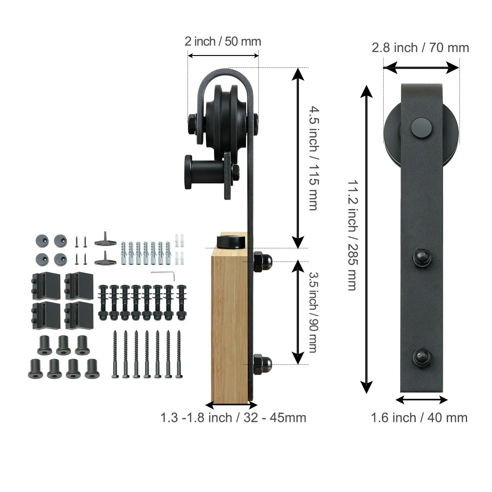 • Heavy Duty and Durable: Our sliding barn door hardware is made of solid carbon steel with fine black powder coated surface. It delivers excellent anti-corrosion performance for years of attractiveness and durability. This 8ft barn door track and hardware kit is suitable for double doors up to 4.3FT wide (2 doors total width) and weighing up to 330lbs, perfect for most doors. Fit Double Doors Total Width: 3.7-4.3FT; Fit Door Thickness: 1.3 "-1.8".