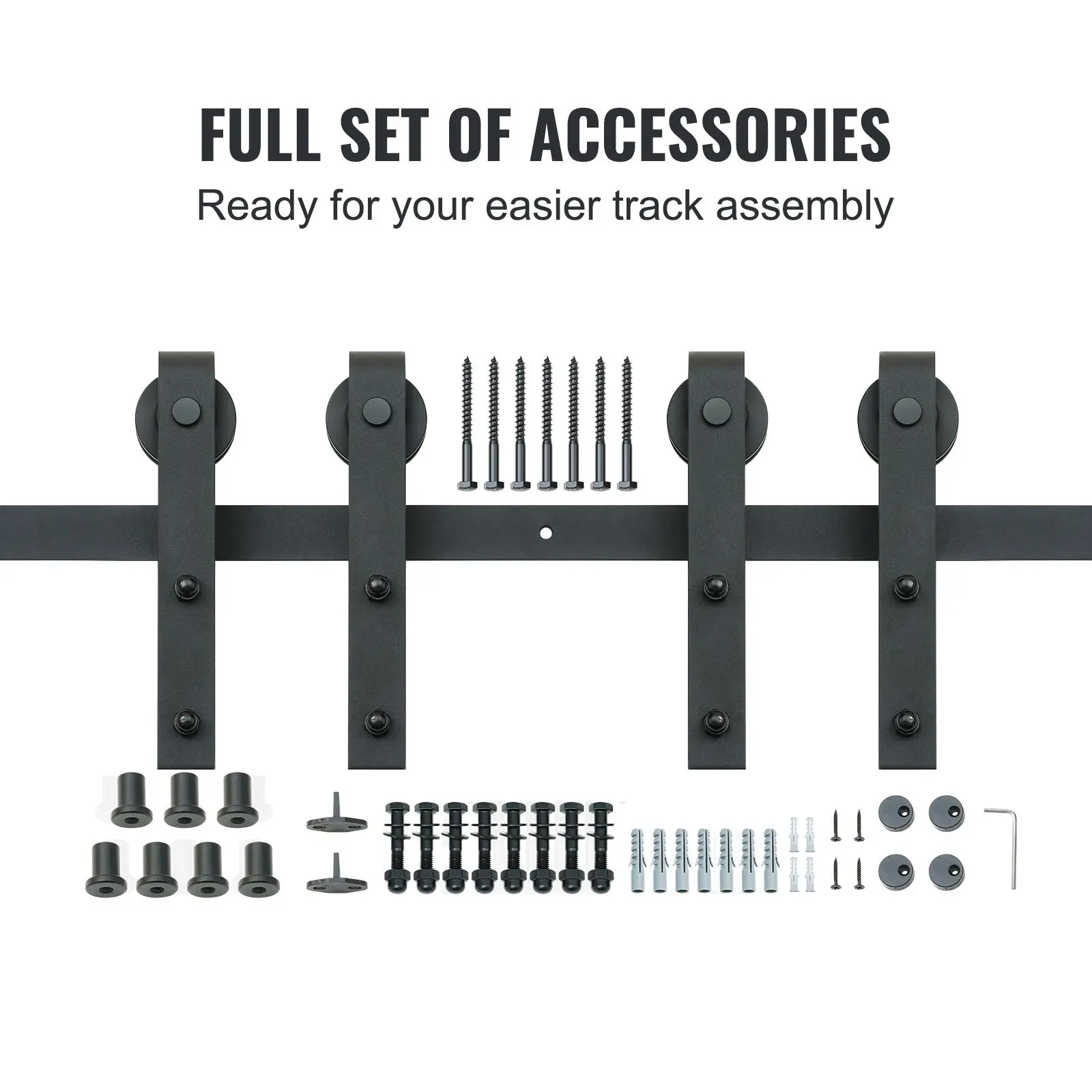 • Easy Installation: The barn door track kit for double doors comes with all the necessary hardware and detailed instructions to make installation a breeze. The barn door hardware kit includes: 2 x 4FT Sliding Barn Door Tracks, 4 x J Hangers, 7 x Plastic Washers, 4 x Anti-jumpers, 4 x Door Stoppers, Installation Manual and Other Assembly Hardware. (Attention: Hardware only, barn door is not included.)