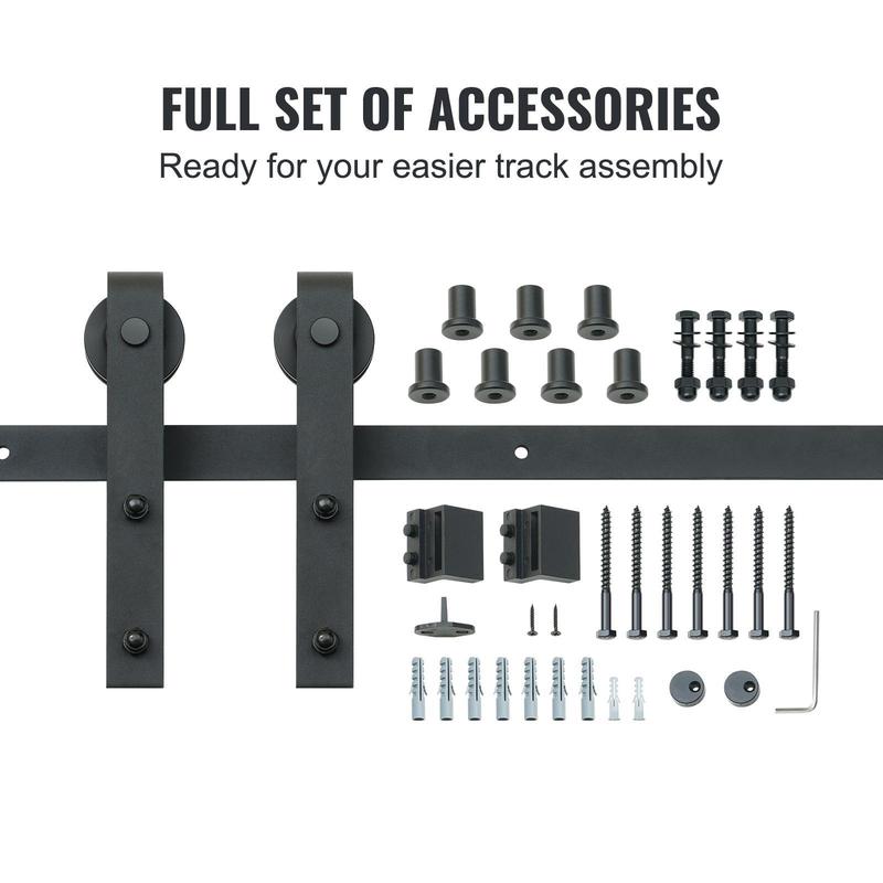 • 2-Section Tracks Sliding System: VEVOR 8ft J-shaped sliding barn door hardware kit comes with 2-section tracks, making the assembly exceptionally simpler and safer. This heavy-duty barn door hardware kit can easily hold up the barn door track without shaking, while the low clearance barn door hardware system requires less space above the doorway, both stable and space-saving!