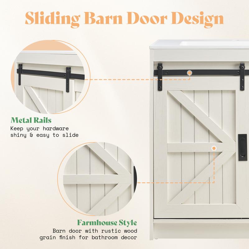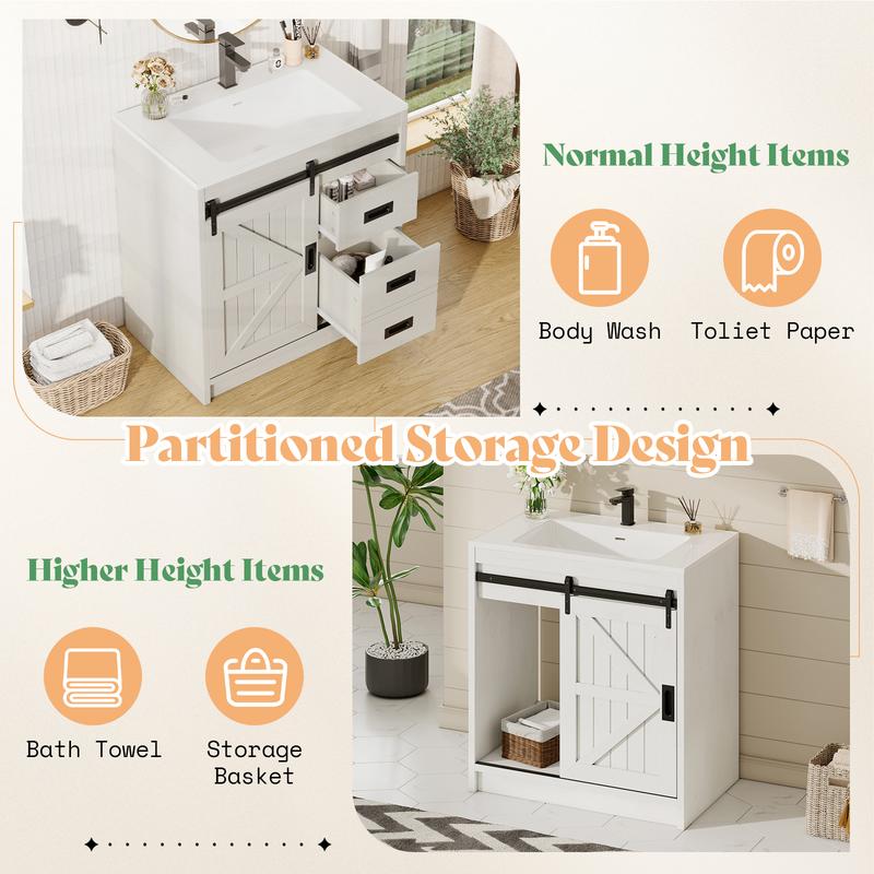 ·Partitioned Storage Space: Large space behind the sliding barn door can store higher height items, 2 sliding drawers can store normal height items, satisfying your daily wash supplies storage needs