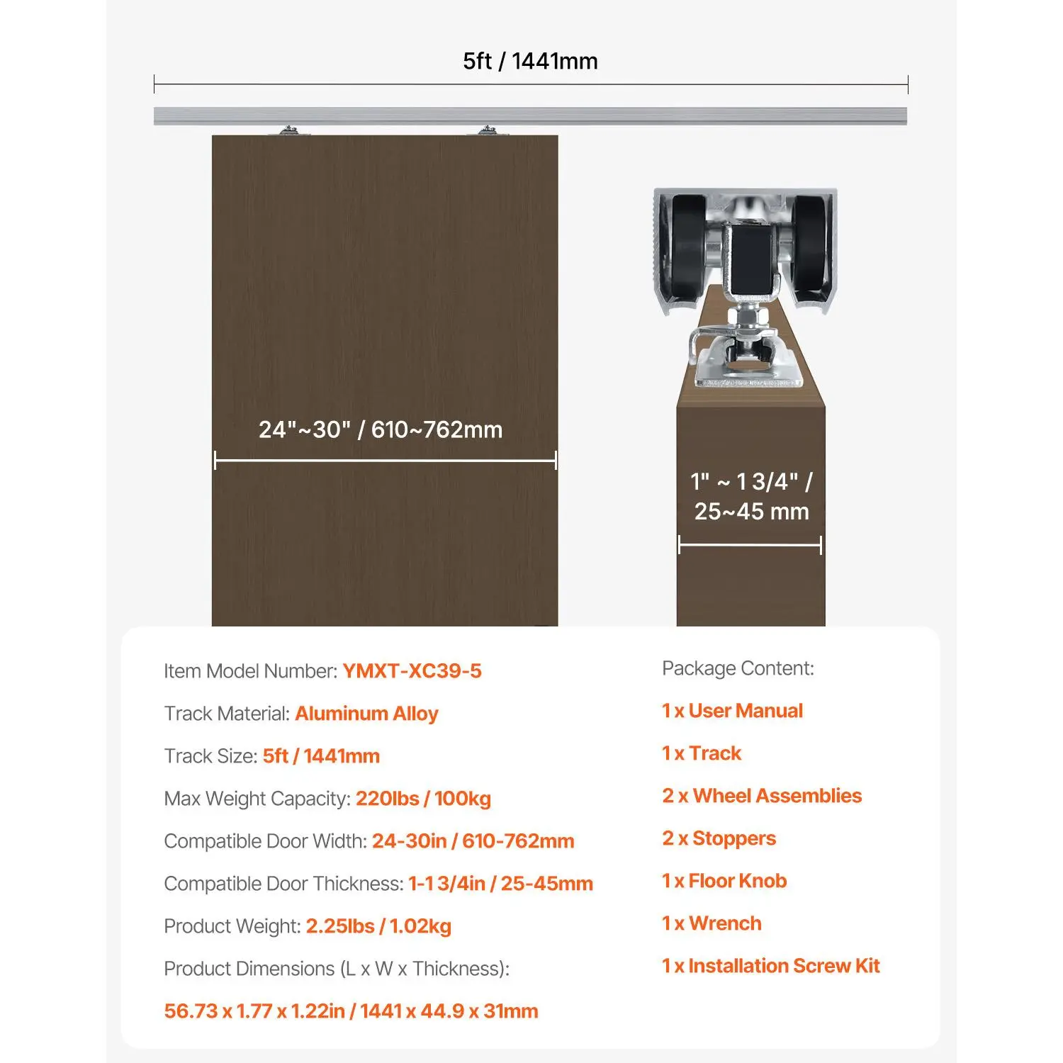• Applicable Door: This 5ft sliding door hardware and track kit fits door thicknesses from 1" to 1 3/4" and door widths from 24" to 30", with a maximum weight capacity of 220 lbs. You can choose the size that suits your needs.