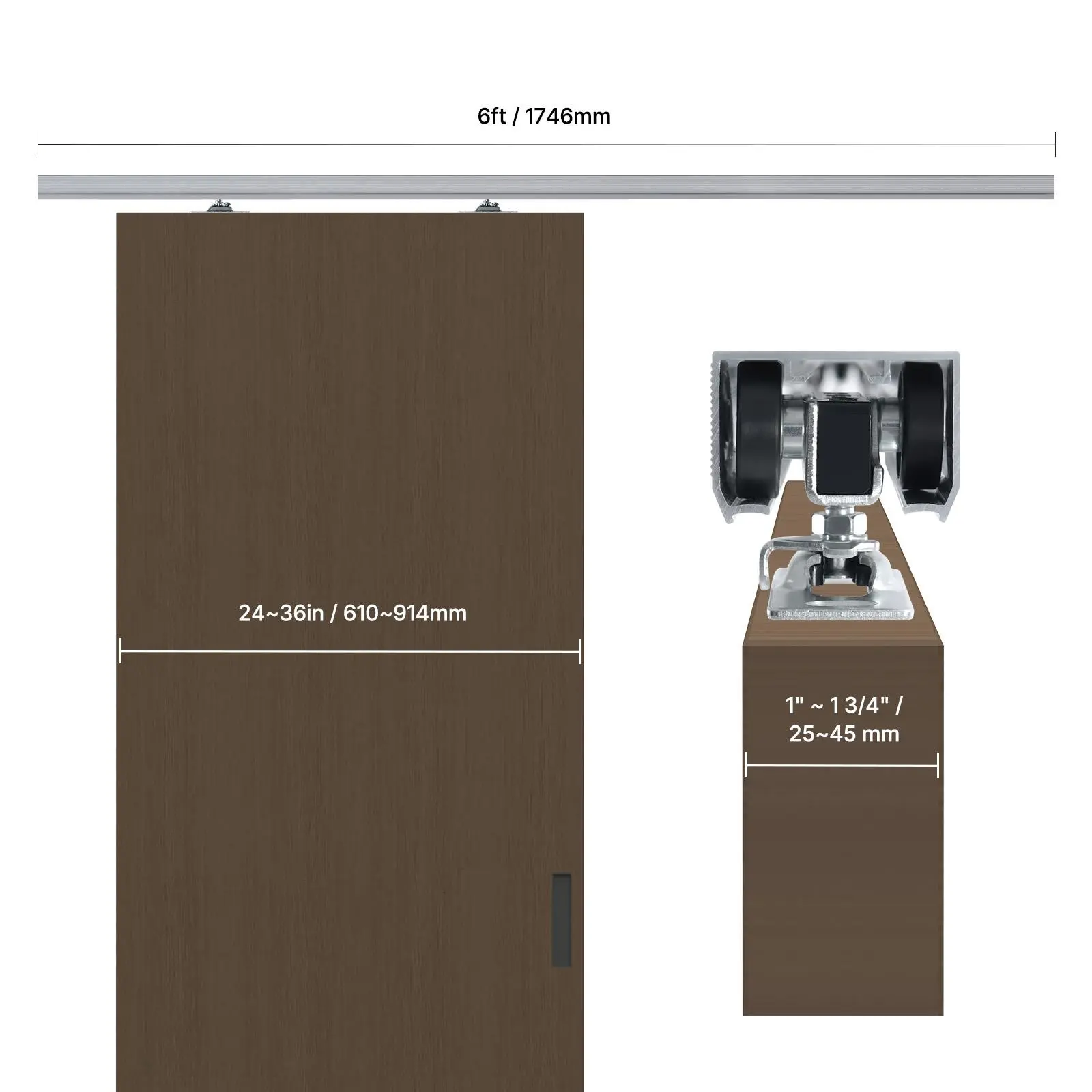 • Applicable Door: This 6ft sliding door hardware and track kit fits door thicknesses from 1" to 1 3/4" and door widths from 24" to 36", with a maximum weight capacity of 220 lbs. You can choose the size that suits your needs.