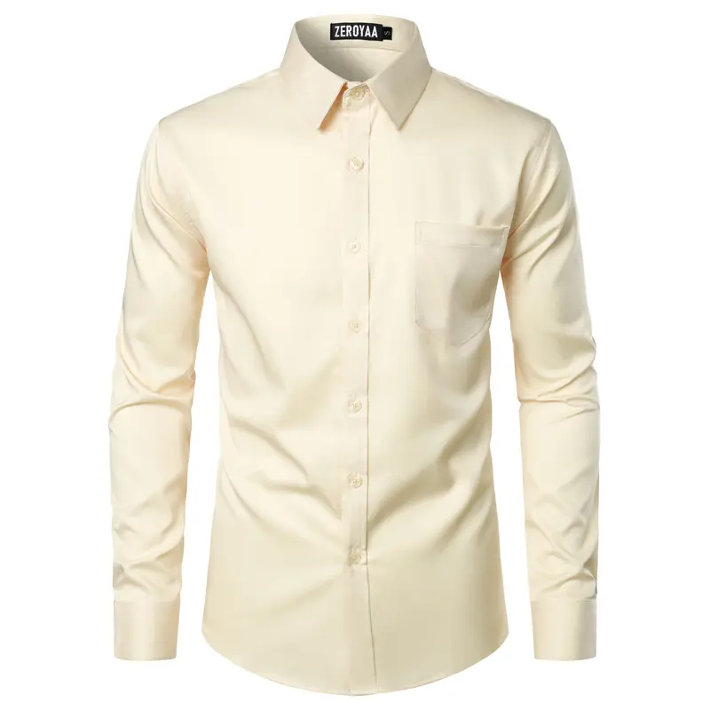ZEROYAA Men's Beige Polyester Long Sleeve Button-Up Dress Shirt with Left Chest Pocket Urban Casual Business Slim Fit Tops