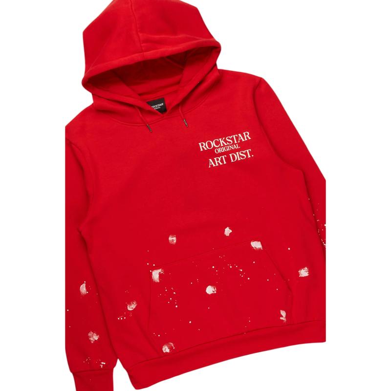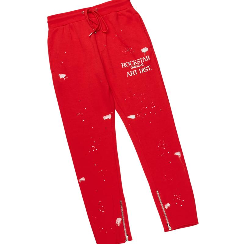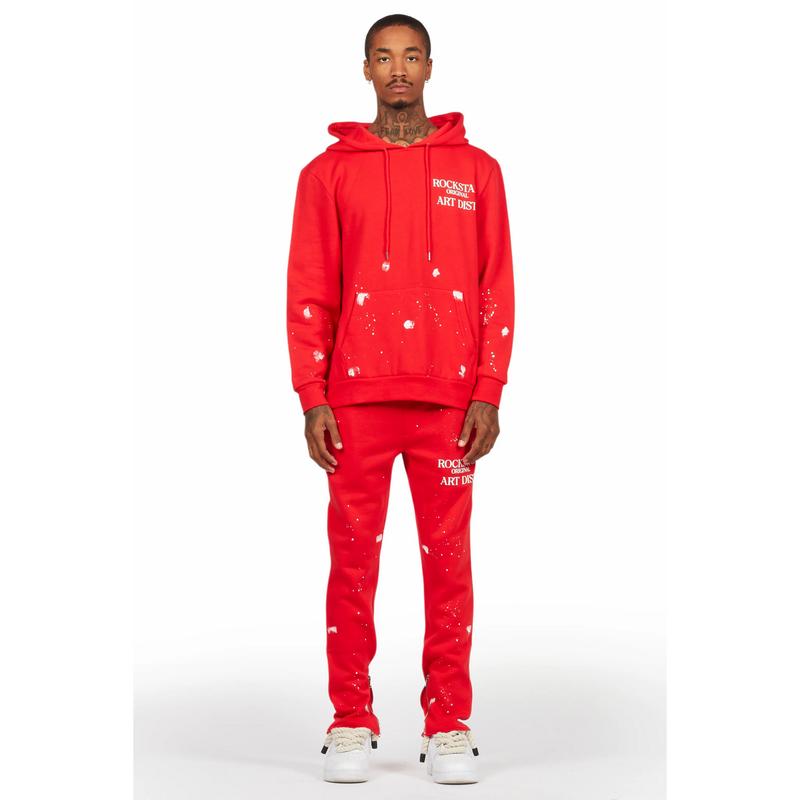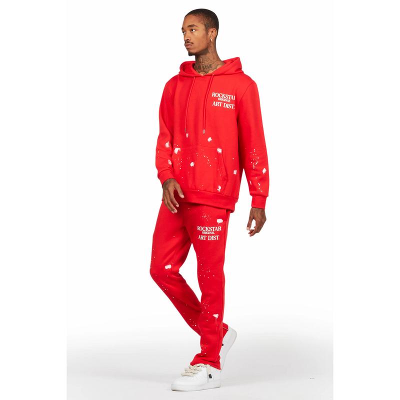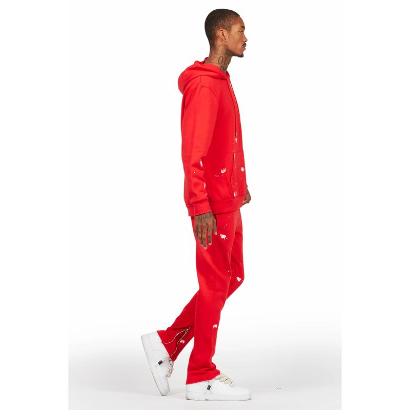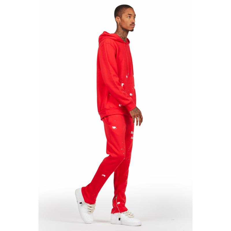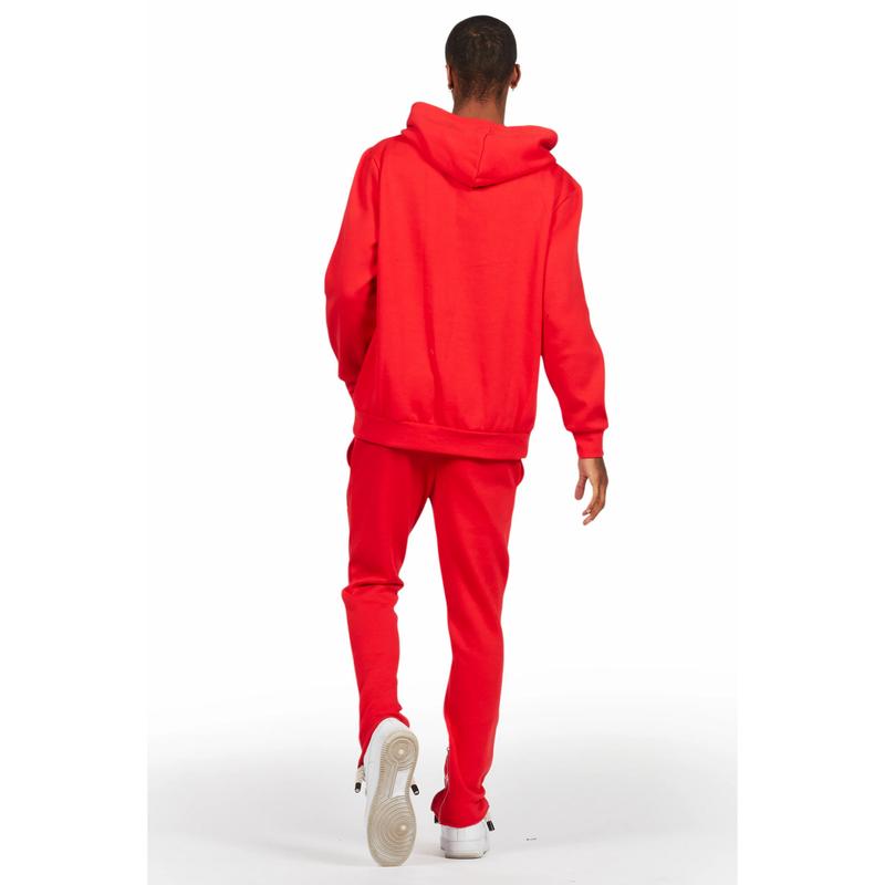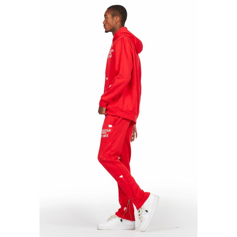 An urban two-piece slim-fit tracksuit set for men in red. Designed with custom detailing for a dope streetwear set.