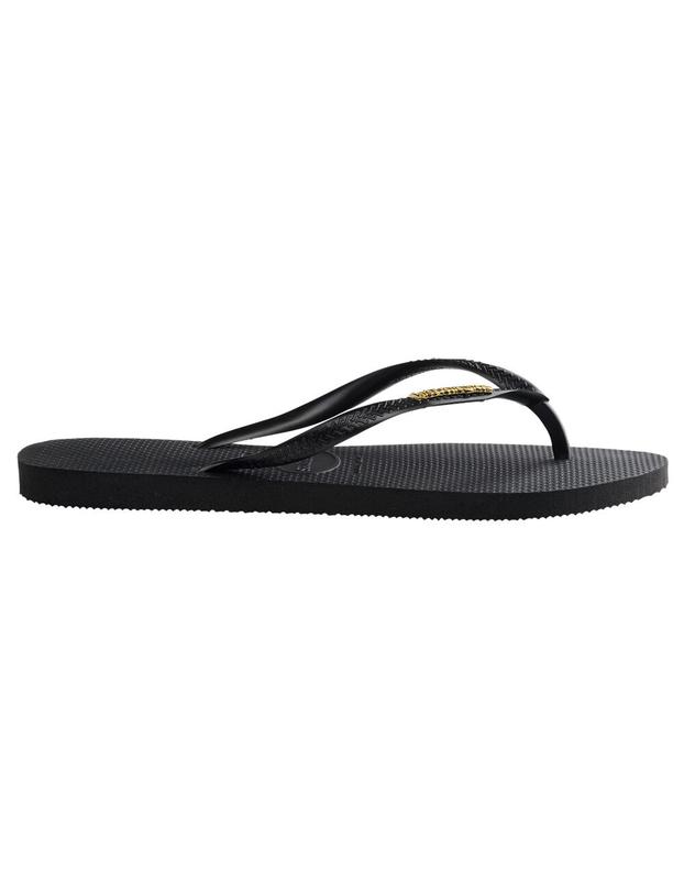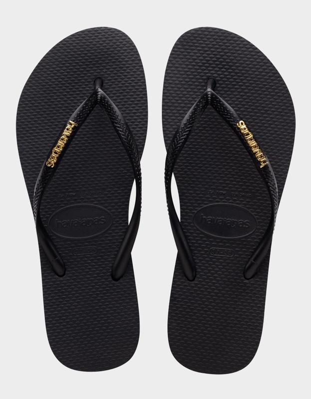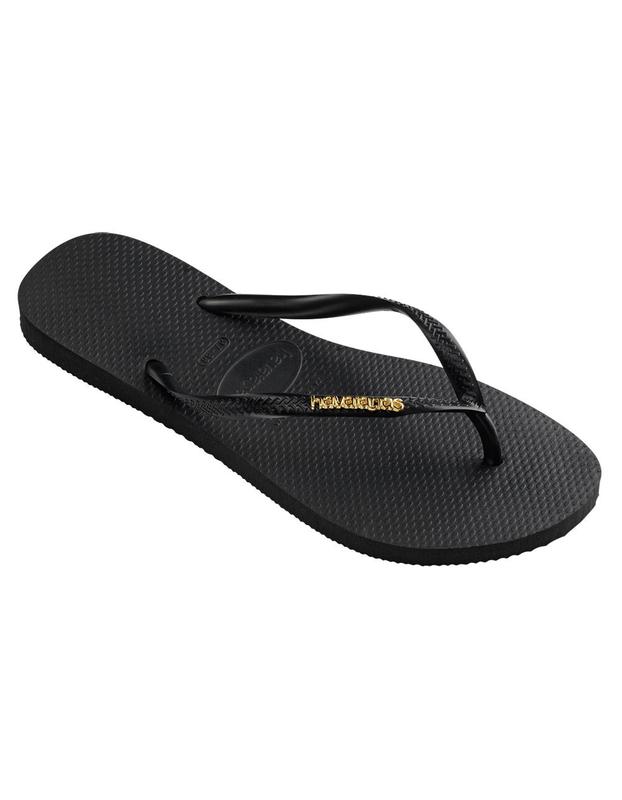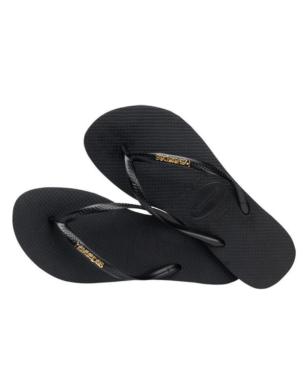 Havaianas Slim Logo Metallic Flip Flops. Love to shine even during leisure time? The Slim Logo Metallic is the pair of flip flops for you! Featuring the silhouette of Havaianas' classic Slim with an eye-popping metallic logo, it’s the perfect style to give you comfort and glow wherever you go. 100% PVC strap. 100% Zamac logo. 100% Rubber outsole. Imported.