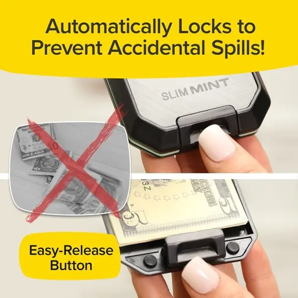 The auto-locking mechanism of Slim Mint keeps your cards and money securely in place. And when you need to access your cards or cash, simply press the button to release the lock.