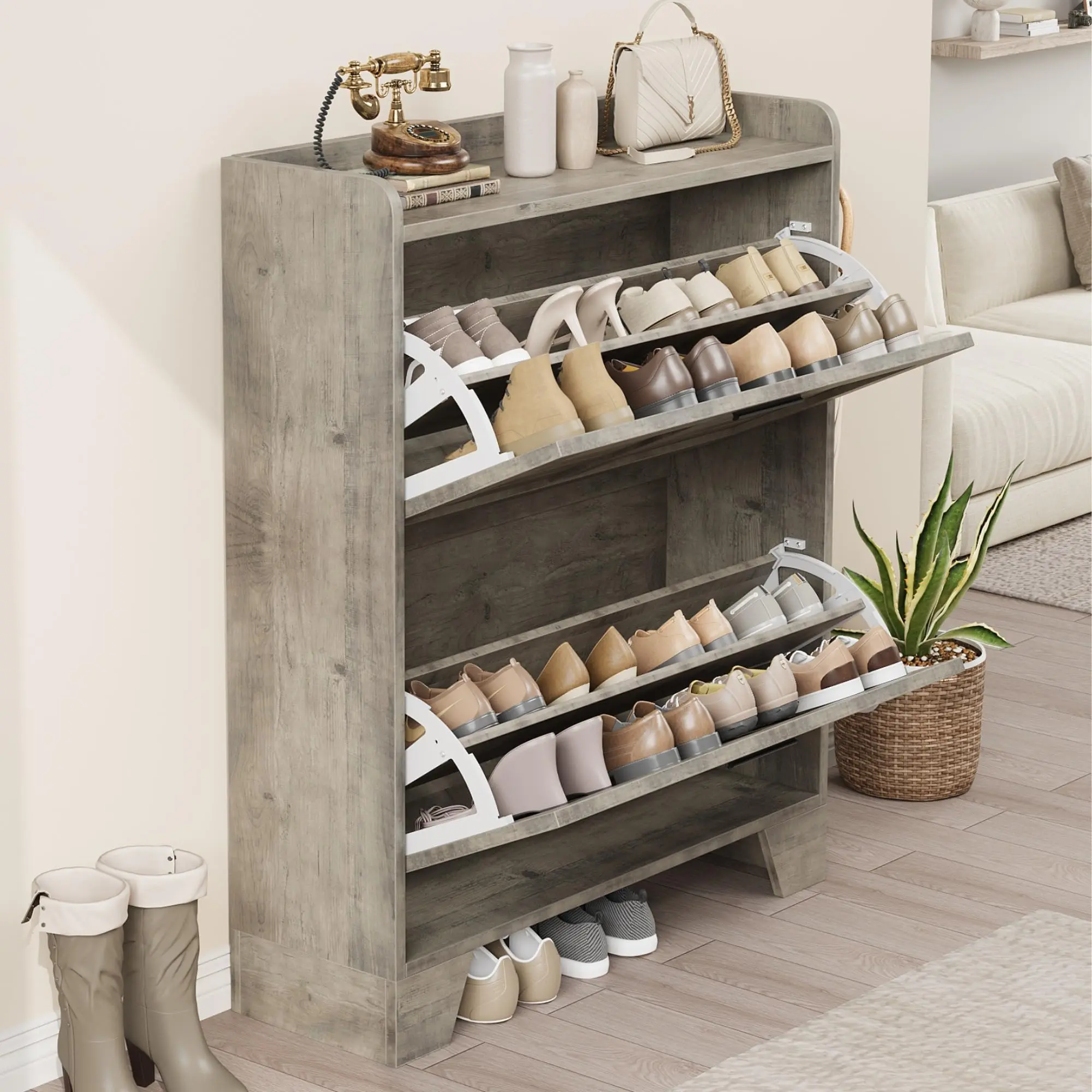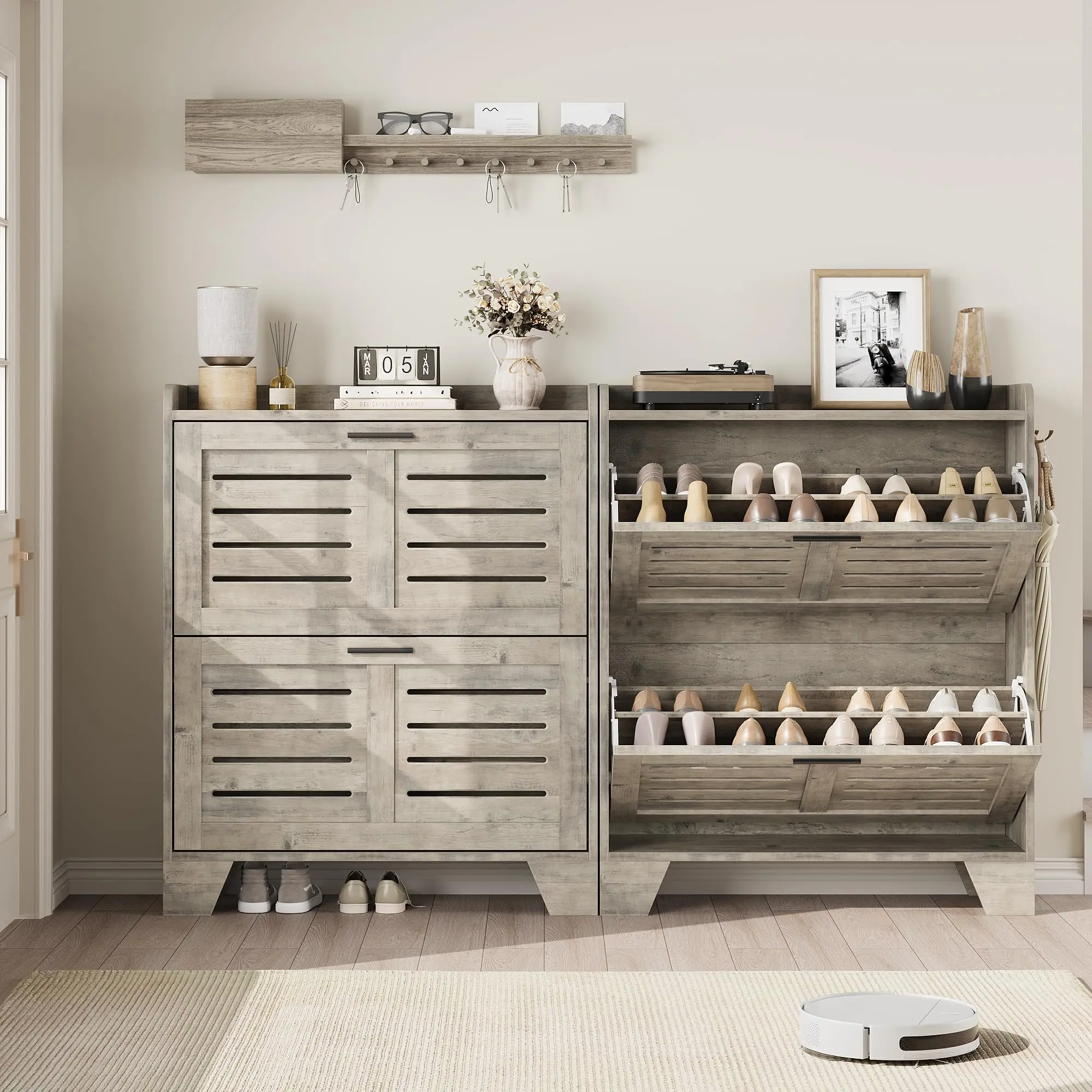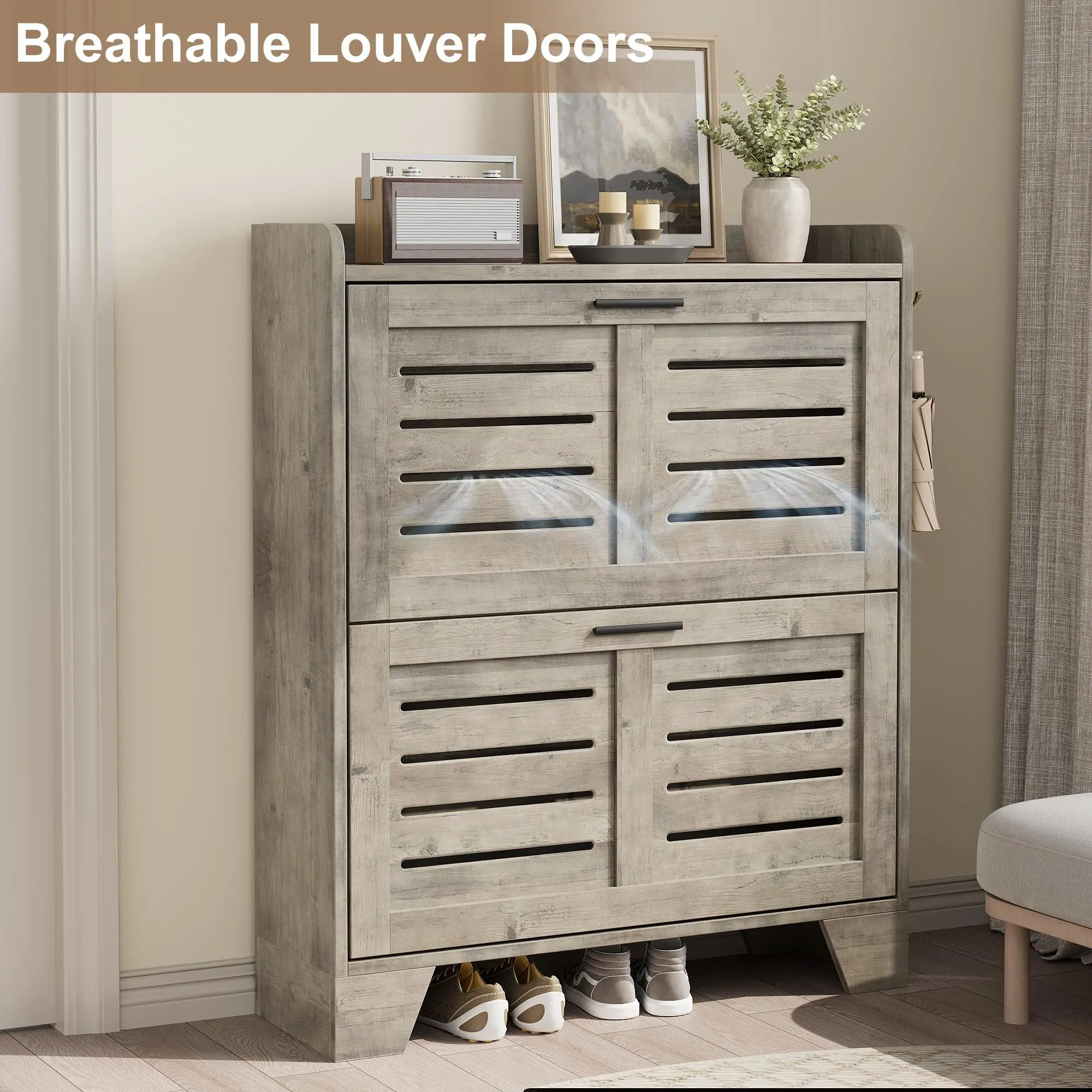3.Enhanced Ventilation with Style - The hidden shoe cabinet features louvered door design promotes airflow to keep your shoes fresh while combining traditional farmhouse and modern elements to fit various decors. Ideal for entryways or hallways, this cabinet not only organizes shoes but also enhances your space’s aesthetic with a neat, sophisticated look