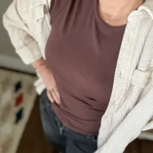 Absolutely love the slinky rib style, cut and fit! Heather grey color is gorgeous. I went a size larger for a much looser fit and still works. Don’t sit on this one! 😉🩶